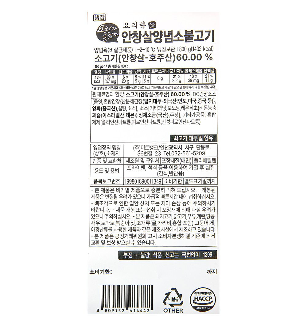 | 제품명 | 안창살 양념 소불고기 | 식품의 유형 | 양념육 |