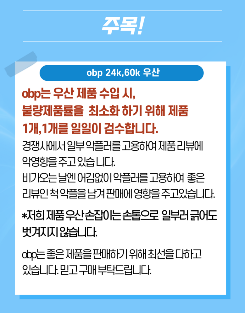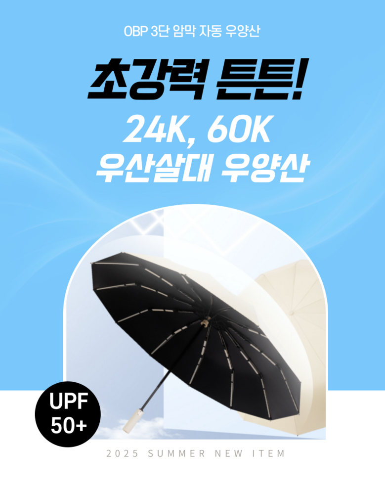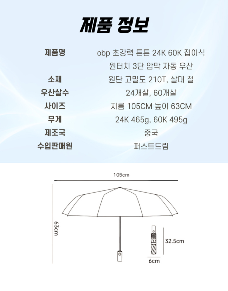 | 품명 및 모델명 | obp 초강력 튼튼 24K 60K 접이식 원터치 3단 암막 자동 우산 | 인증/허가 사항 | 인증 필수 제품 아님 |