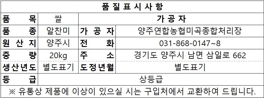 | 제조연월일, 소비기한 또는 품질유지기한 | 업데이트 예정 | 세부 품목군별 표시사항 | 농수산물 : 유전자변형(해당 없음) / 지리적 표시사항(해당 없음) |