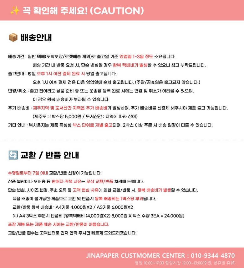 - ㆍ모니터 해상도의 차이로 인해 색상이나 이미지가 실제와 달라, 고객이 단순 변심으로 교환/반품을 무료로 요청하는 경우