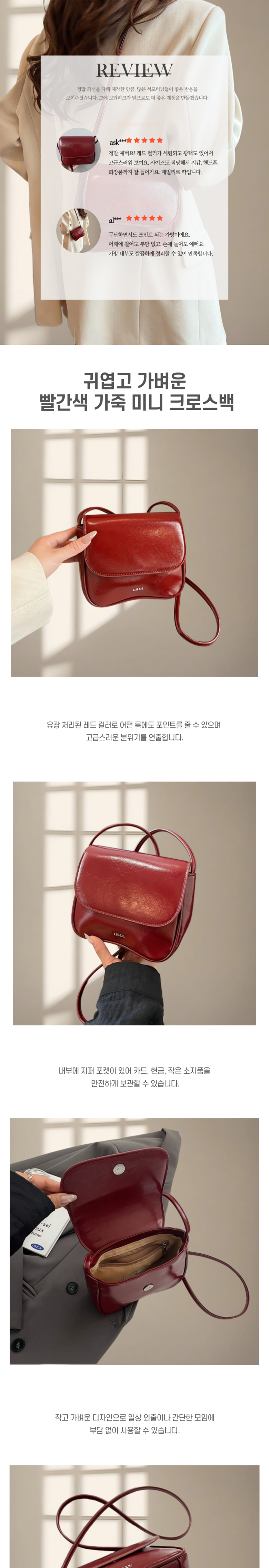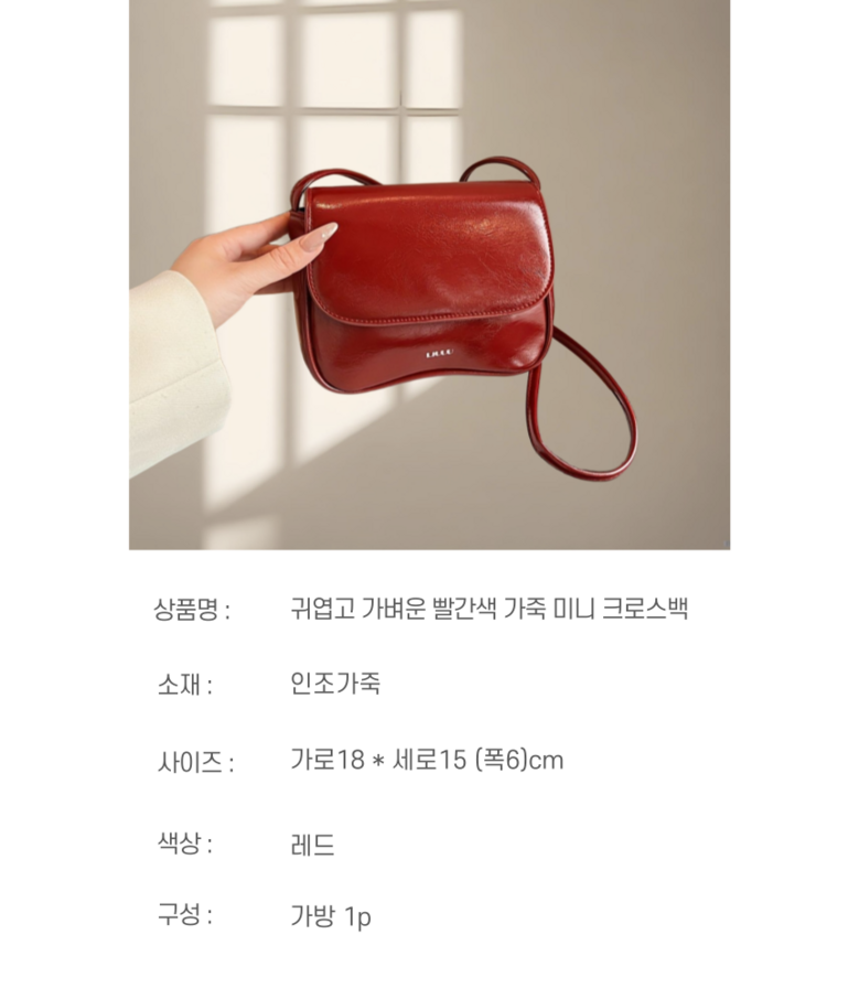 | 품명 및 모델명 | 귀엽고 가벼운 빨간색 가죽 미니 크로스백 | 인증/허가 사항 | 해당사항없음 |