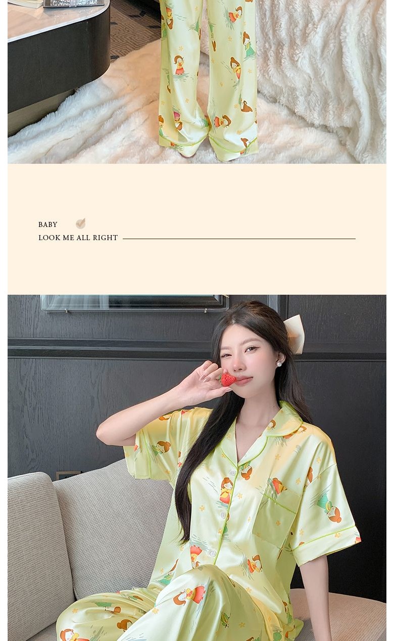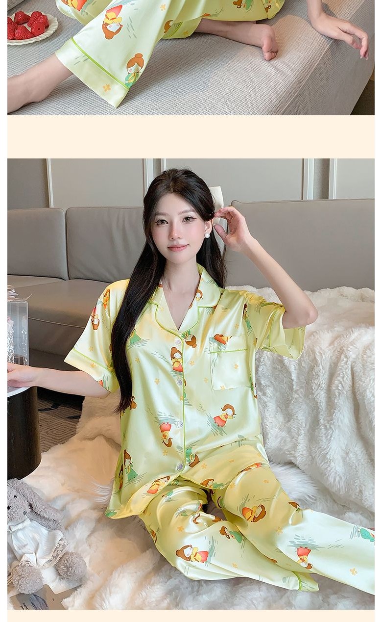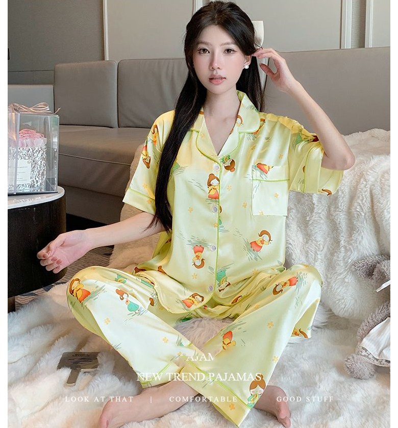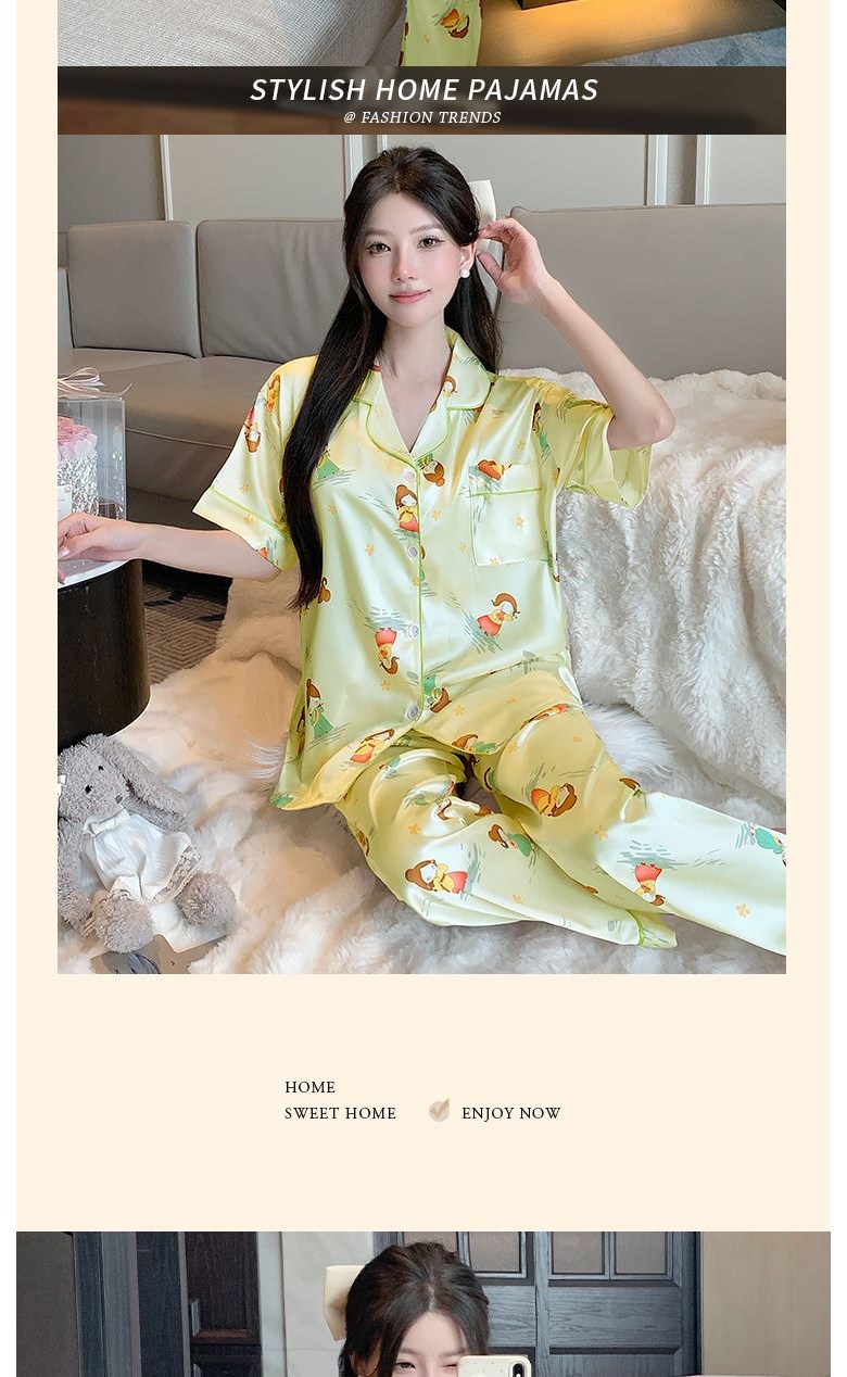 고급 여름 브이넥 실크 아이스 얇은 세트 여자 잠옷 반팔 긴바지 파자마 홈웨어