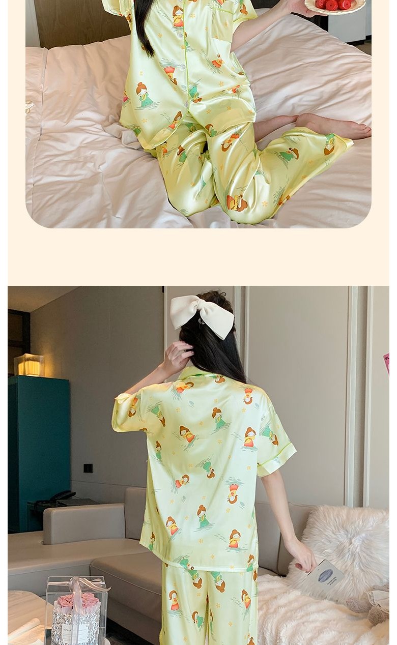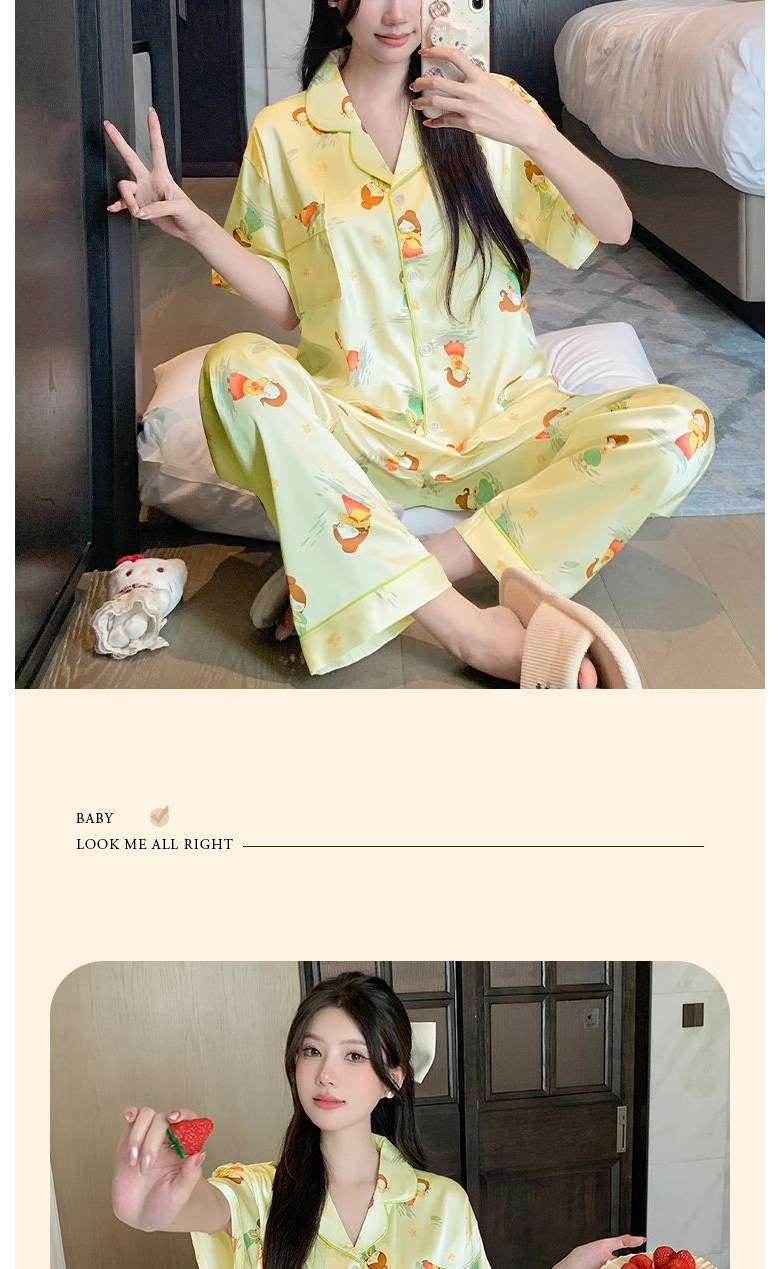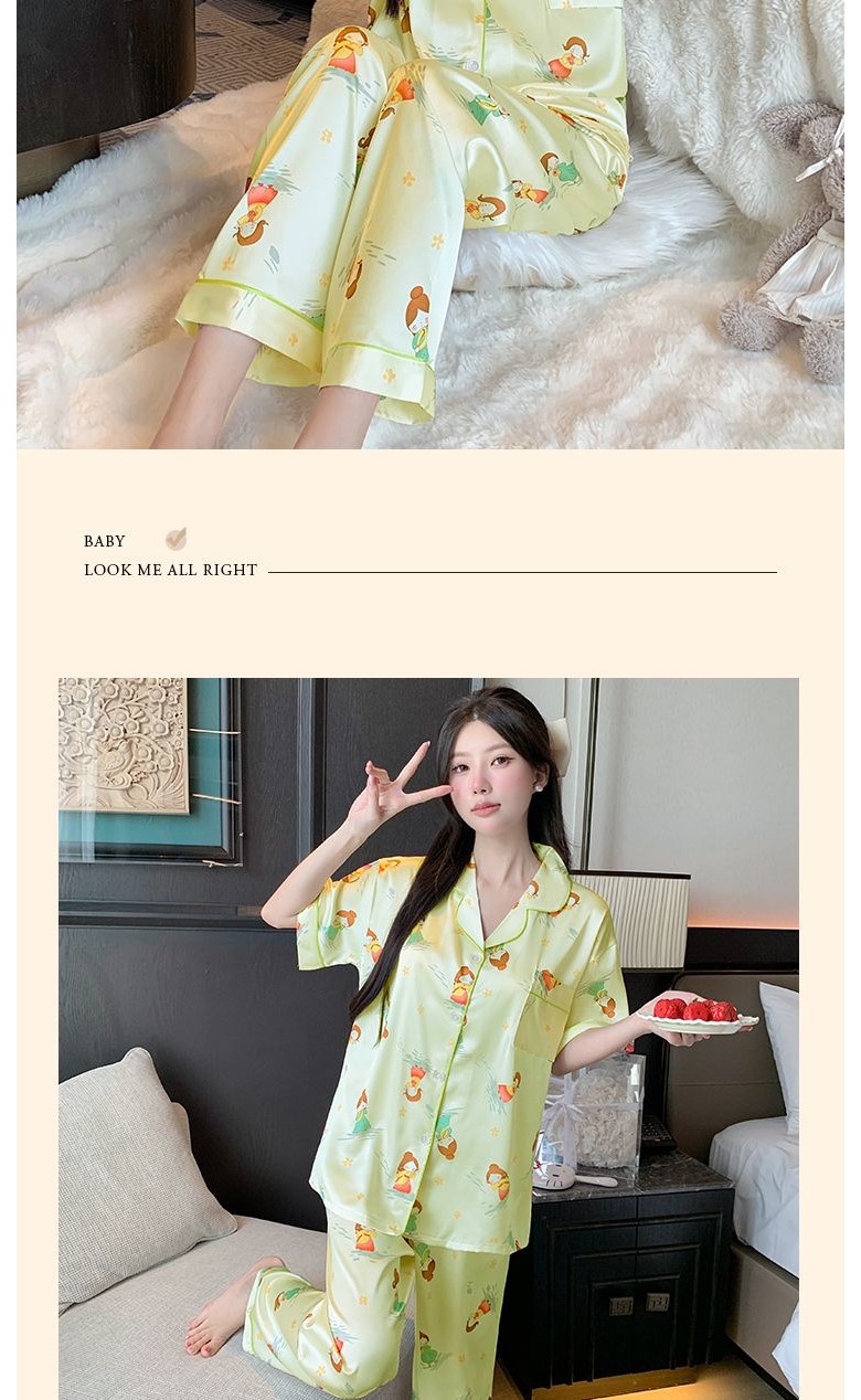 고급 여름 브이넥 실크 아이스 얇은 세트 여자 잠옷 반팔 긴바지 파자마 홈웨어