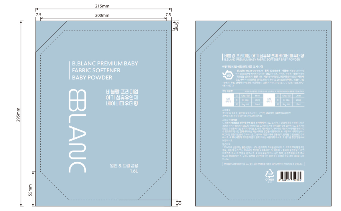 | 품목 및 제품명 | 섬유유연제 / 비블랑 프리미엄 아기 섬유유연제 베이비파우더향 | 용도(표백제의 경우 계열을 함께표시) 및 제형 | 가죽용,섬유용,신발용 / 액체형 |