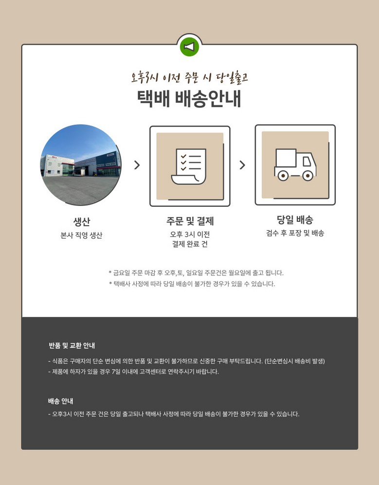 | 배송기간 | ㆍ도서산간 지역 등은 배송에 3-5일이 더 소요될 수 있습니다. - 천재지변, 물량 수급 변동 등 예외적인 사유 발생 시, 다소 지연될 수 있는 점 양해 부탁드립니다. | ||