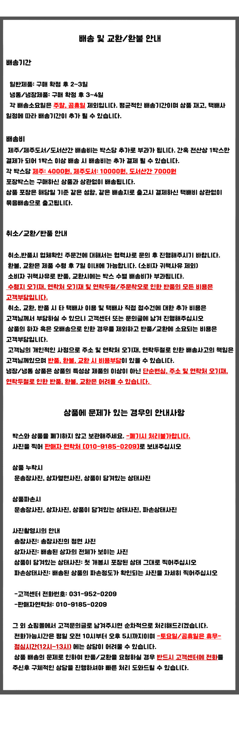- ㆍ교환/반품에 관한 일반적인 사항은 판매자가 제시사항보다 관계법령이 우선합니다.