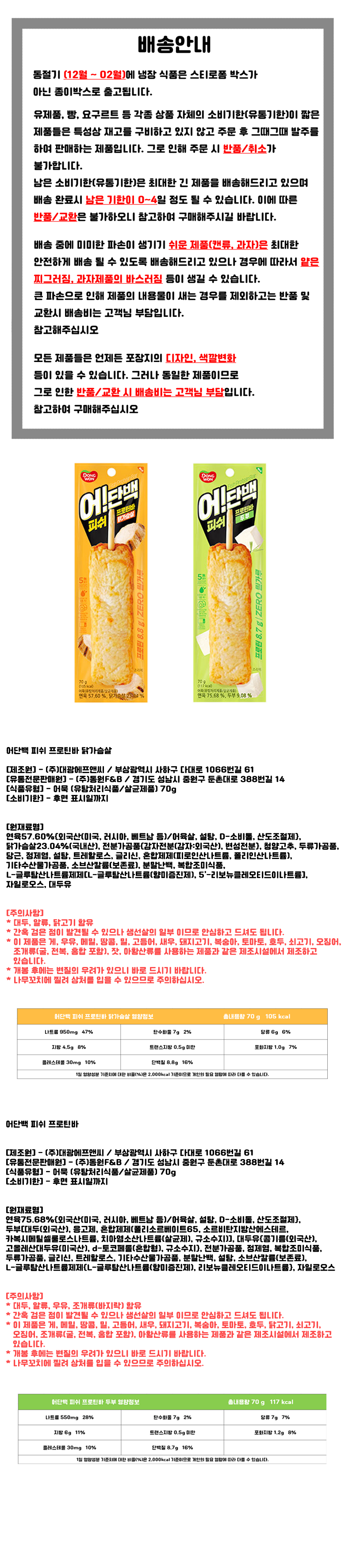 | 배송방법 | 신선/냉장/냉동 | 배송비 | 무료배송 - 도서산간 지역 배송불가 |