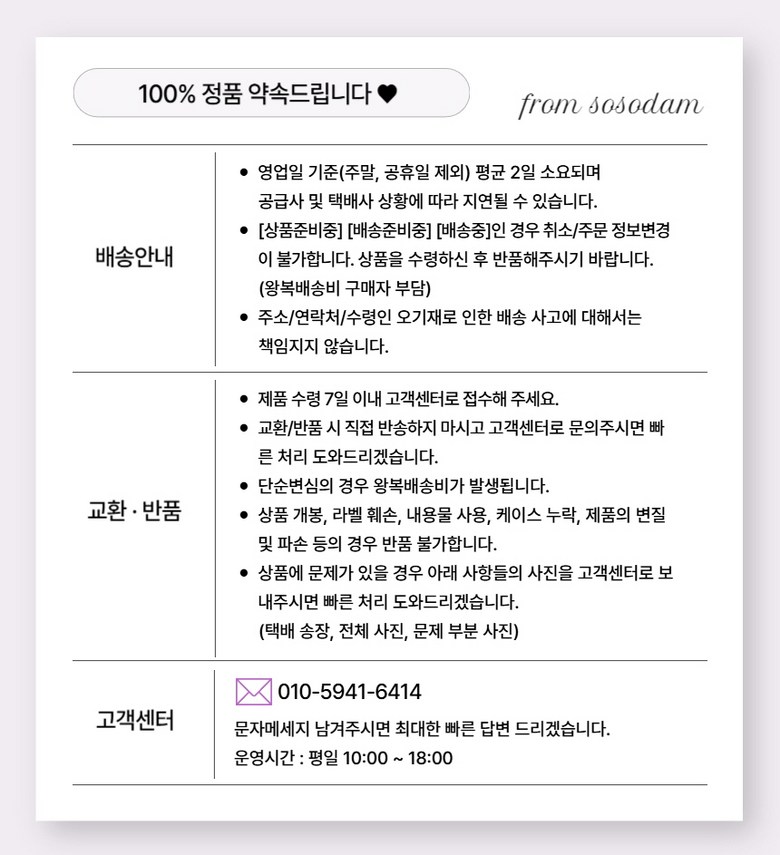 | 배송기간 | ㆍ도서산간 지역 등은 배송에 3-5일이 더 소요될 수 있습니다. - 천재지변, 물량 수급 변동 등 예외적인 사유 발생 시, 다소 지연될 수 있는 점 양해 부탁드립니다. | ||