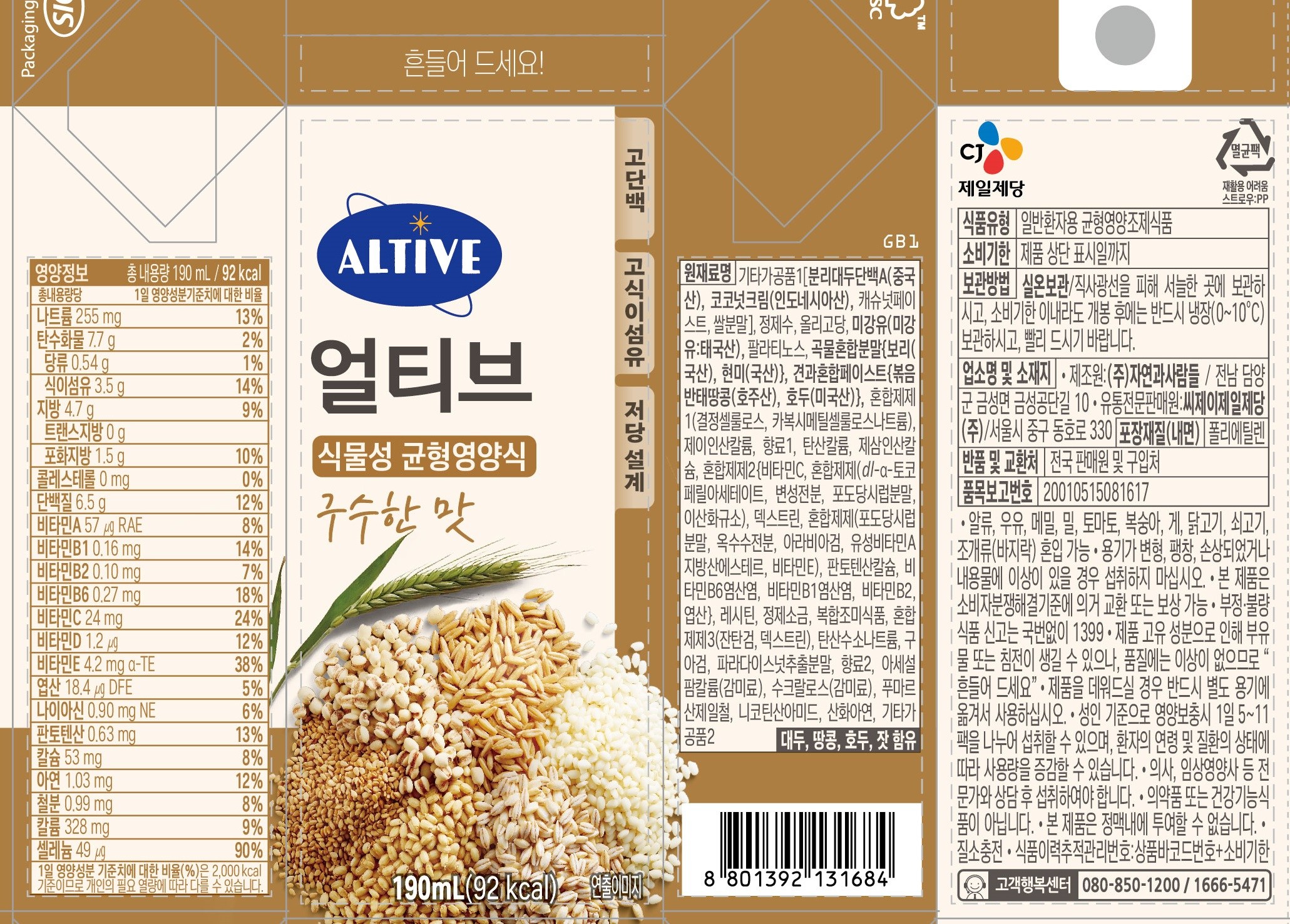 | 제품명 | 얼티브 식물성 균형영양식 구수한 맛 | 식품의 유형 | 컨텐츠 참조 |