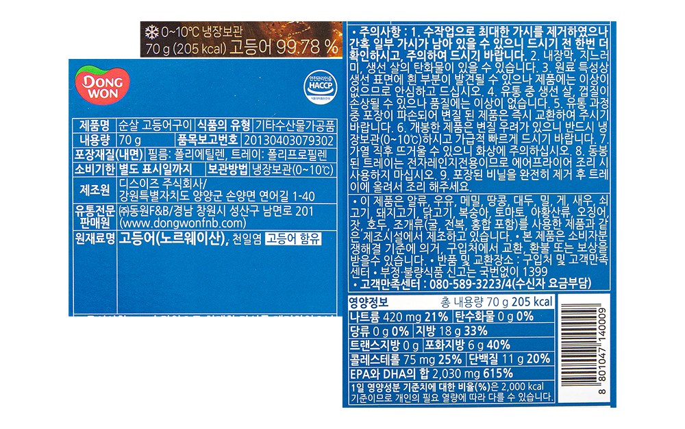 가시를 바르고 살만 남긴 순살 고등어구이예요. 동봉된 트레이 그대로 전자레인지에 넣고 조리할 수 있어 편리하답니다. 살이 쉽게 부서지지 않고, 탄탄한 식감이 일품이죠. 고소한 풍미는 물론, 천일염을 사용해 짭조름한 감칠맛까지 더했으니 밥반찬으로 즐겨보세요.