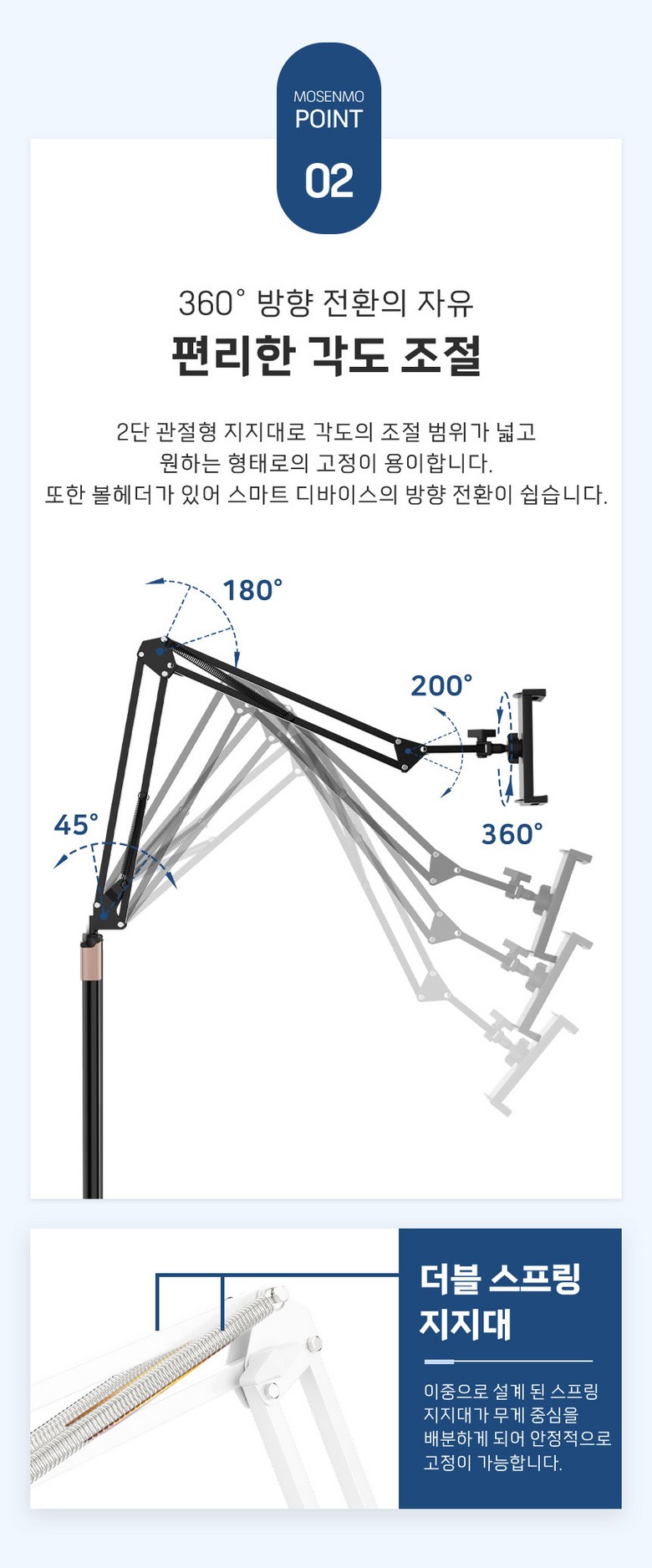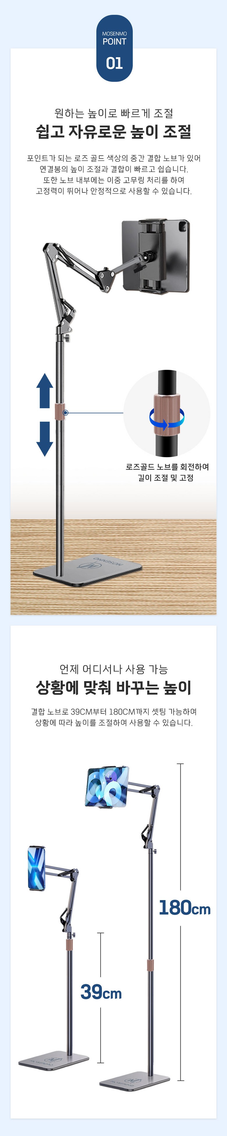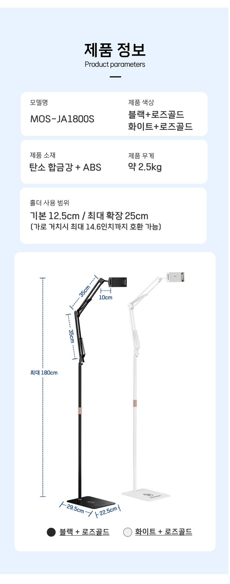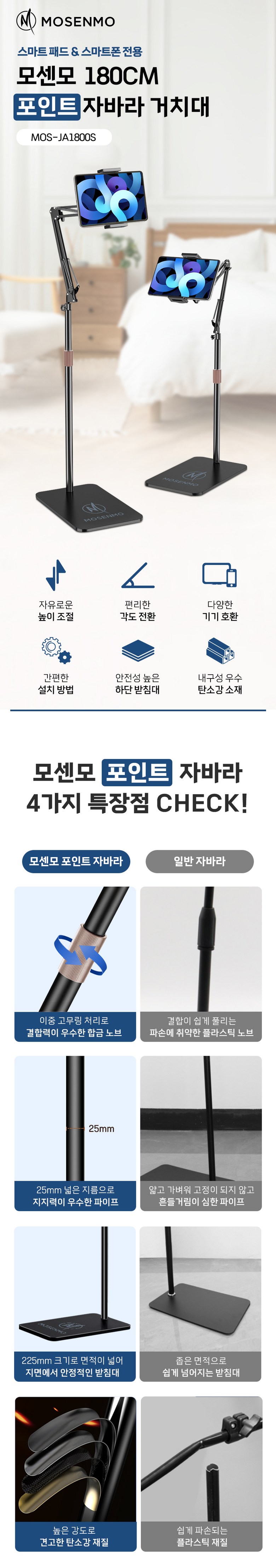 | 품명 및 모델명 | 모센모 180cm 포인트 높이 조절 스마트 패드&스마트폰 스탠드형 더블 스프링 자바라 거치대, MOS-JA1800S(무광 블랙, 무광 화이트) | KC 인증정보 | 해당없음 |