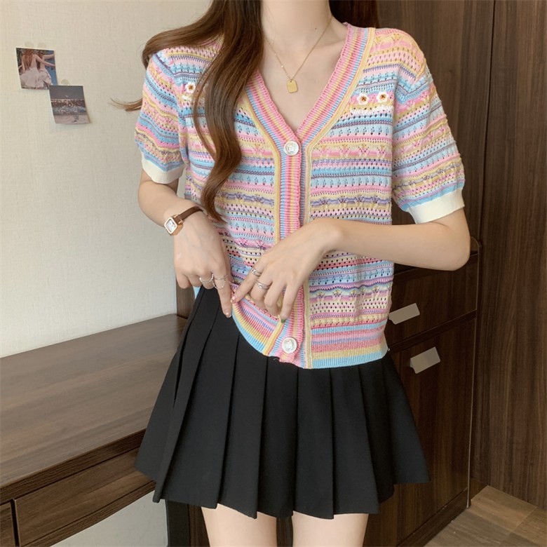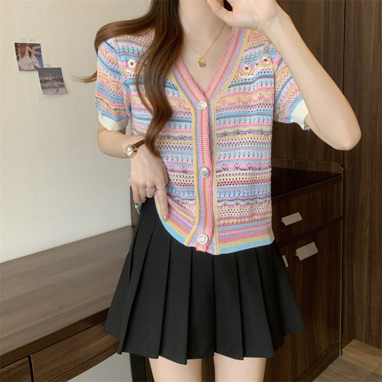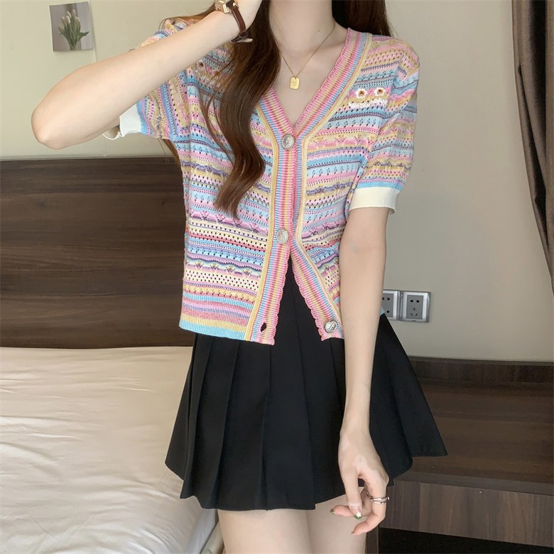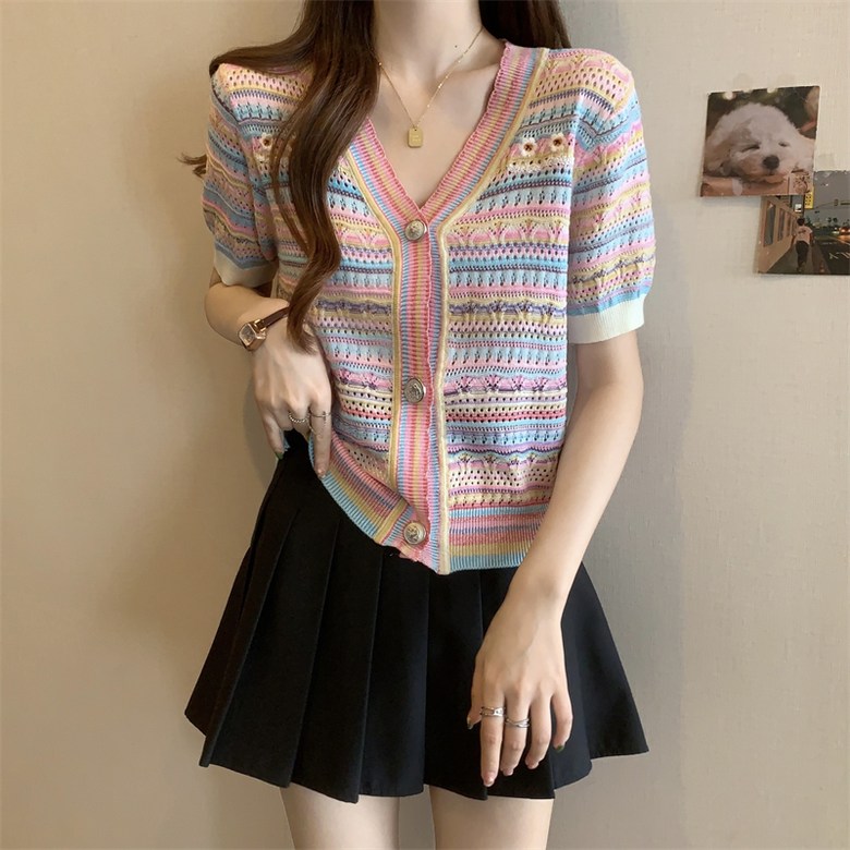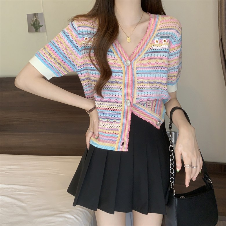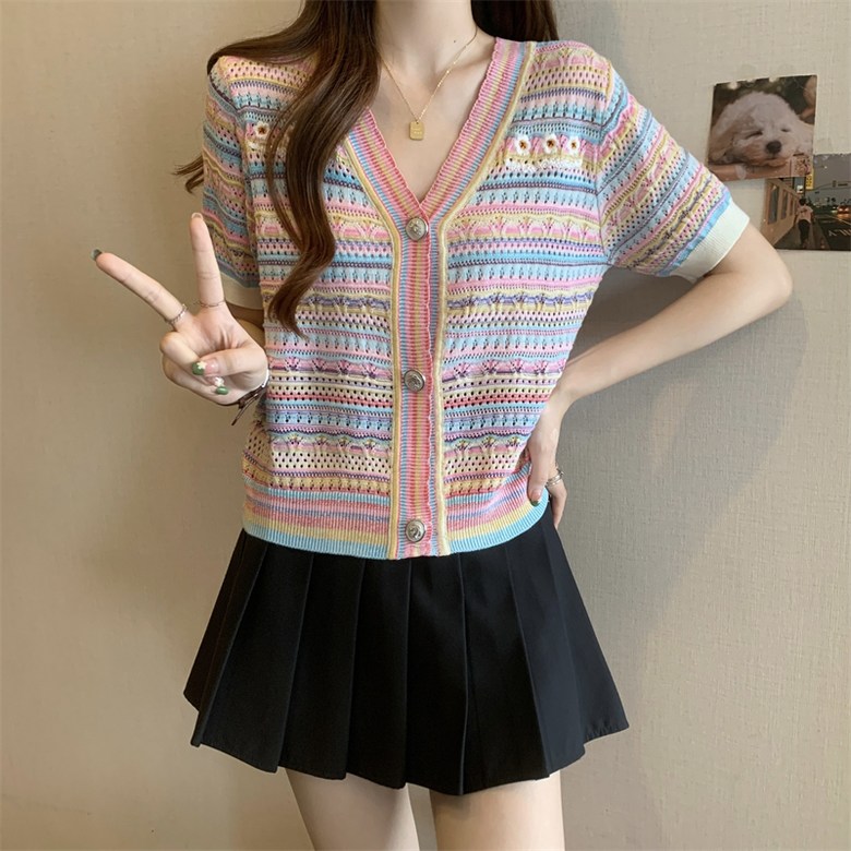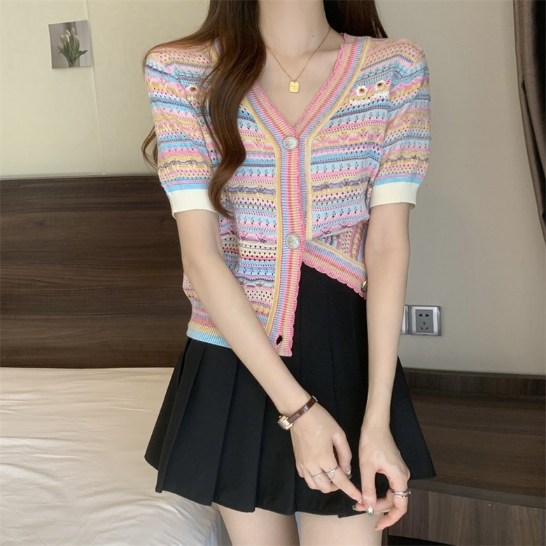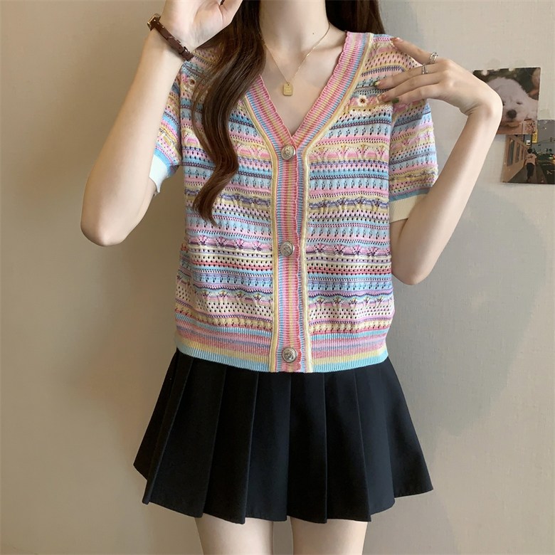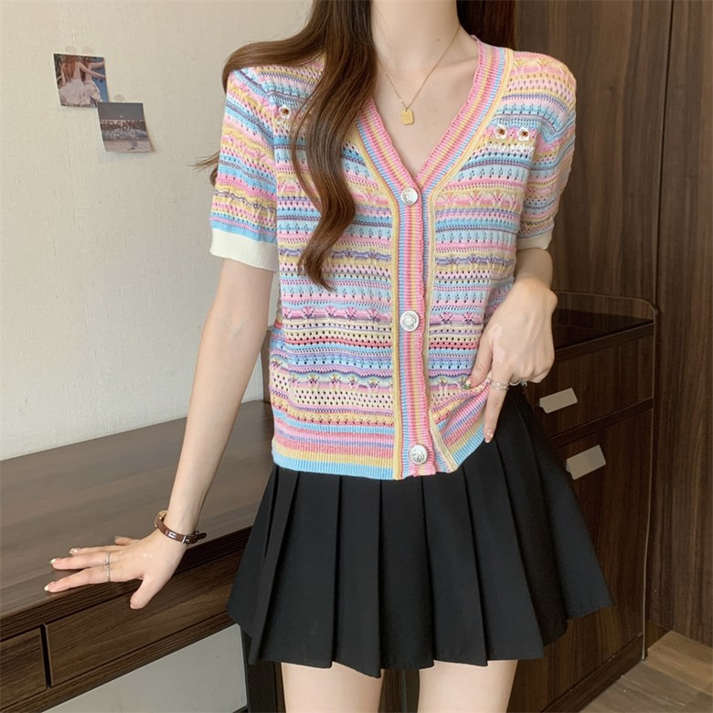 AD1738여자 봄 여름 가을 고퀄 면혼방 린넨 골지 니트 브이 와이넥 반팔 단추장식 스트라이프 무지개 패턴 티셔츠 니트티 티 이너 상의 이지웨어 데일리룩
