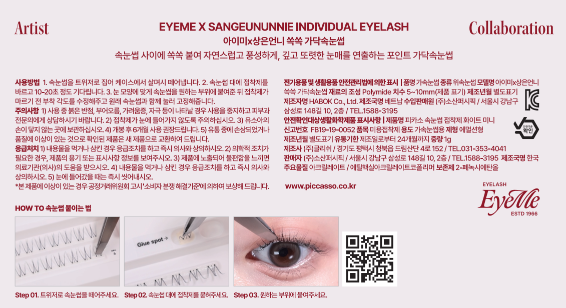 | 품명 및 모델명 | [피카소] 아이미X상은언니 쏙쏙 가닥속눈썹 언더 5mm 블랙 1개 | 인증/허가 사항 | 가속눈썹 : 유/KC마크 | 접착제 : FB19-19-0052 |