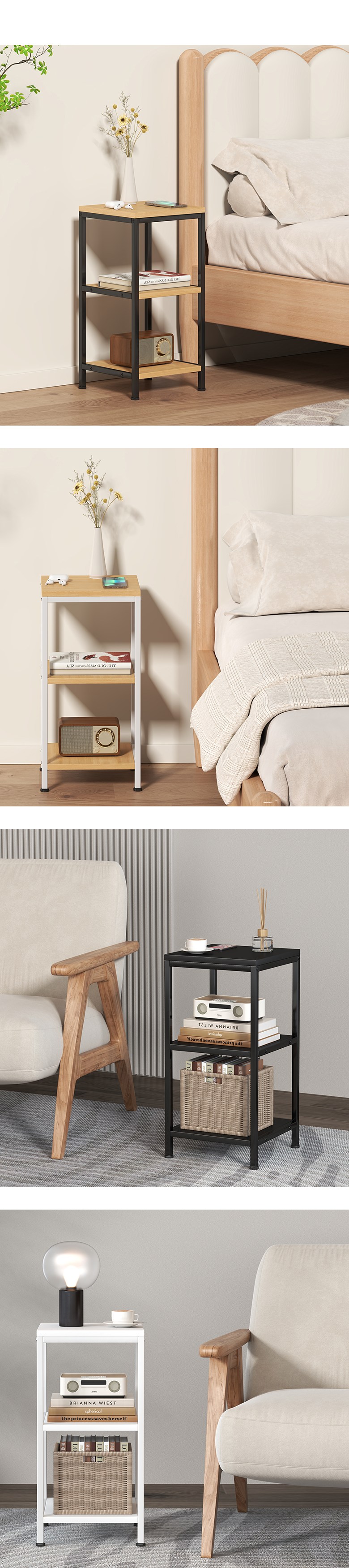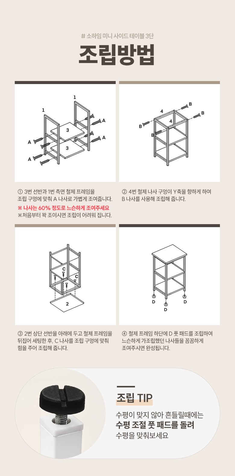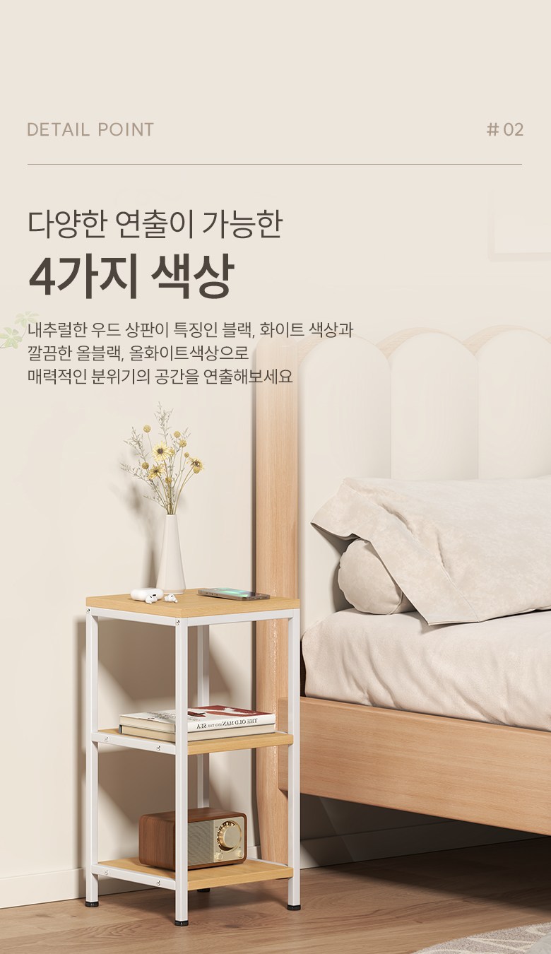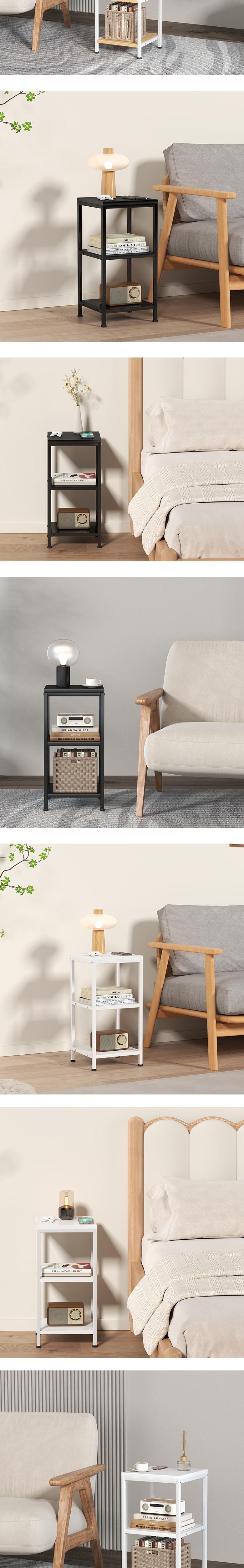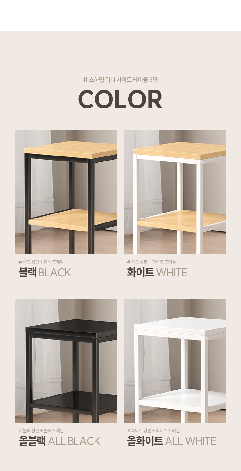 | 색상 | 화이트, 블랙 (철제프레임 색상), 올화이트, 올블랙 | 구성품 | 소하임 미니 사이드 테이블 3단 1개철제프레임, 상 / 하판, 조립나사 |