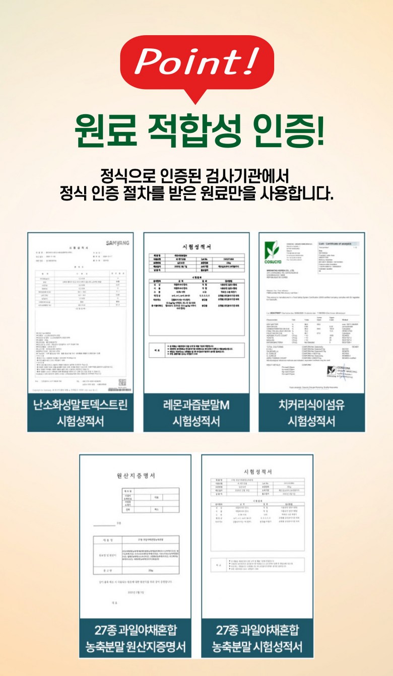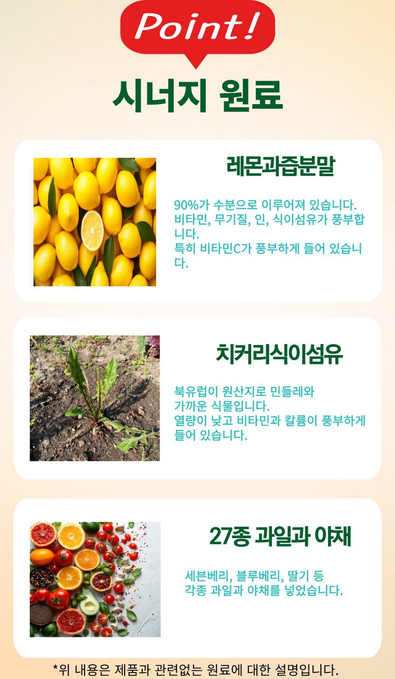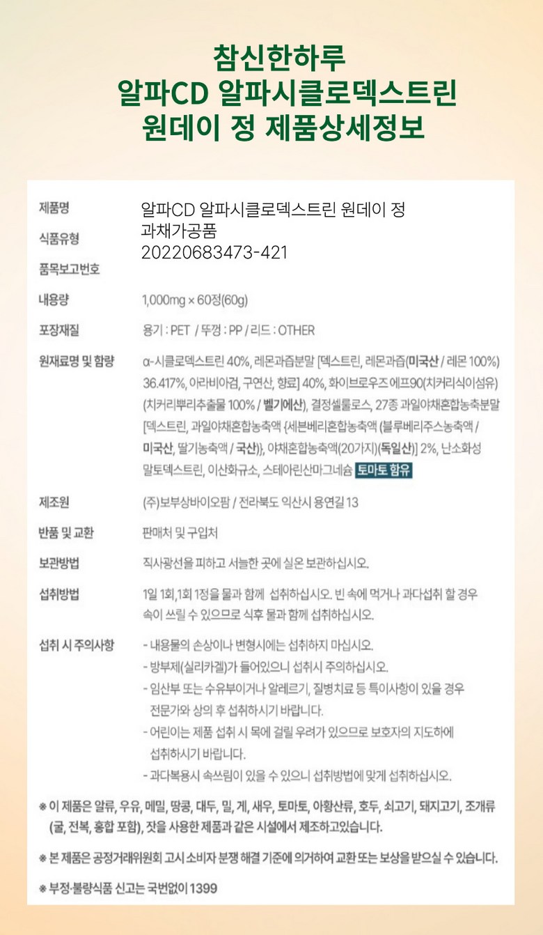 | 포장단위별 내용물의 용량(중량), 수량 | 1000mgX60정, 60g | 원재료명 및 함량 | 알파-시클로덱스트린 40%, 레몬과즙분말(덱스트린, 레몬과즙/미국산/레몬100%)36.417%, 아라비아검, 구연산, 향료)40%, 화이브로우즈에프90(치커리식이섬유)(치커리뿌리추출물100%/벨기에산), 결정셀롤로스, 27종과일야채혼합농축분말[덱스트린, 과일야채혼합농축액(세븐베리혼합농축액(블루베리주스농축액/미국산, 딸기농축액/국산))야채혼합농축액(20가지)(독일산)]2%, 난소화성말토덱스트린, 이산화규소, 스테아린산마그네슘, 토마토함유 |
