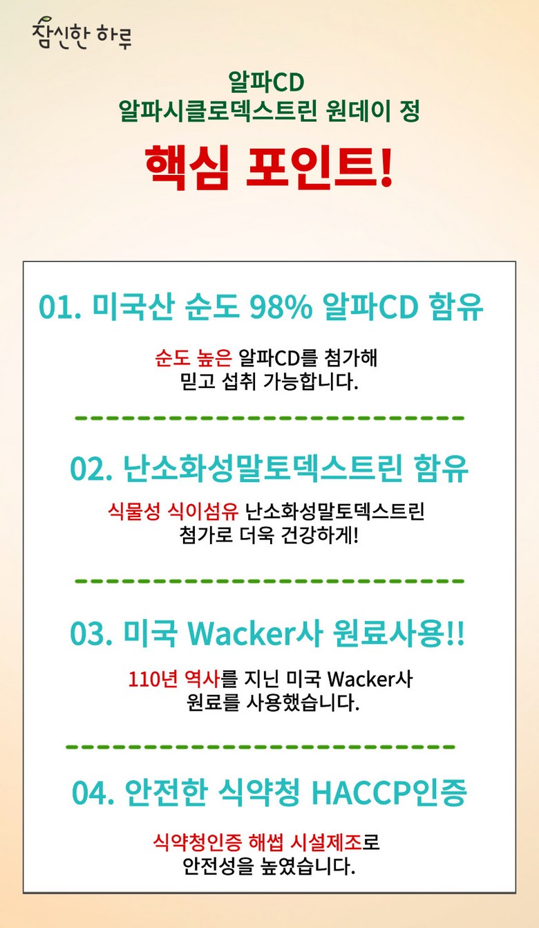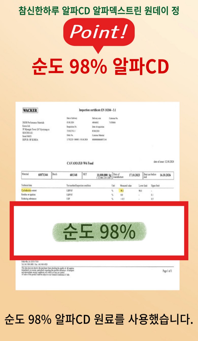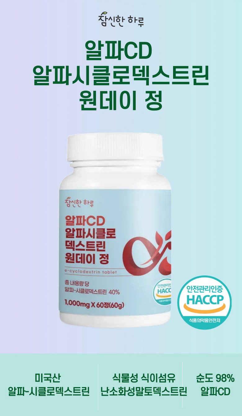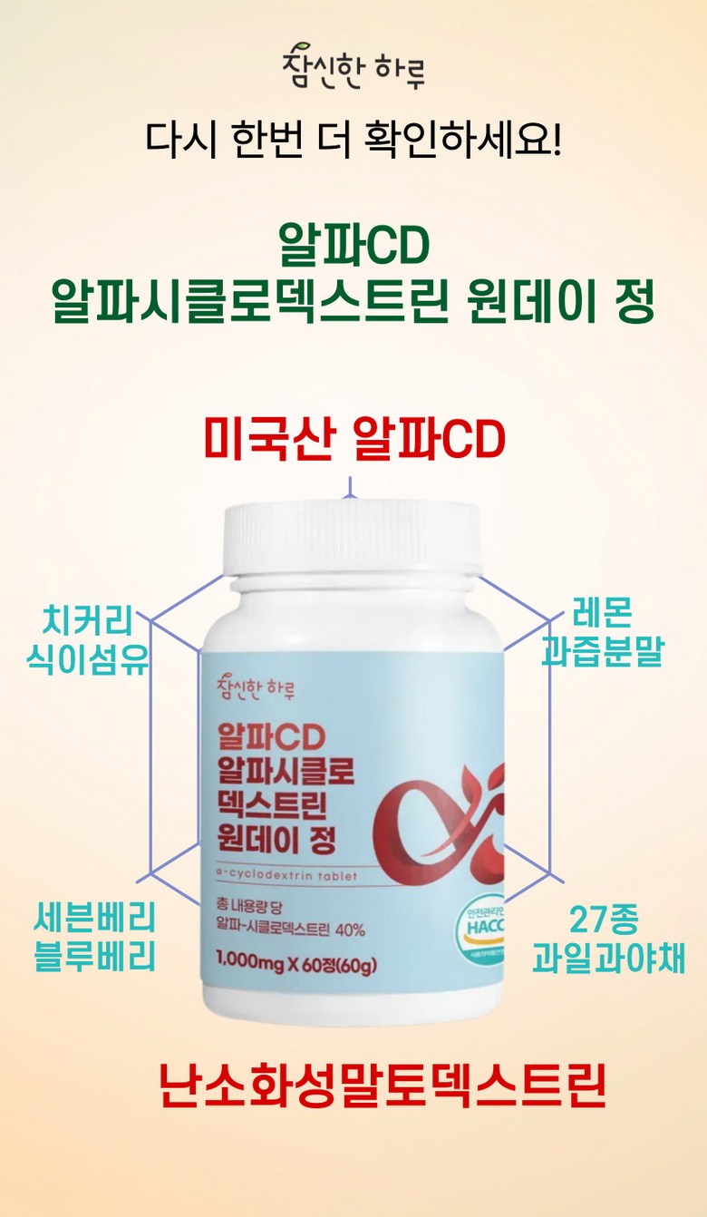 | 제품명 | 참신한하루 알파CD 알파시클로덱스트린 원데이 정 | 식품의 유형 | 과채가공품 |