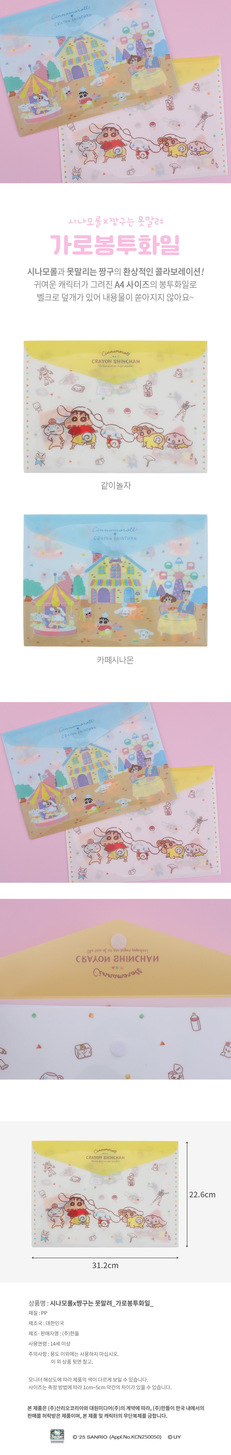 | 품명 및 모델명 | 시나모롤x짱구는 못말려 가로봉투화일 같이놀자 | 인증/허가 사항 | 해당없음 (14세 이상) |