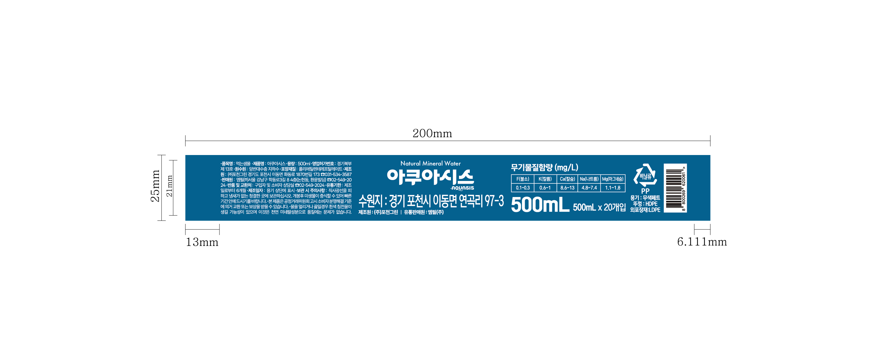 | 포장단위별 내용물의 용량(중량), 수량 | 500ml x 40개 | 원재료명 및 함량 | 컨텐츠 참조 |