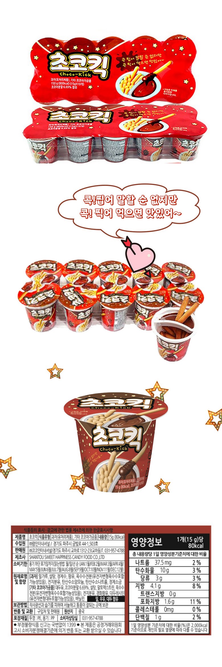 | 포장단위별 내용물의 용량(중량), 수량 | 초코킥 찍어먹는 과자 한정행사 60개(15gx60개) | 원재료명 및 함량 | 상세 페이지를 참조 하세요. |