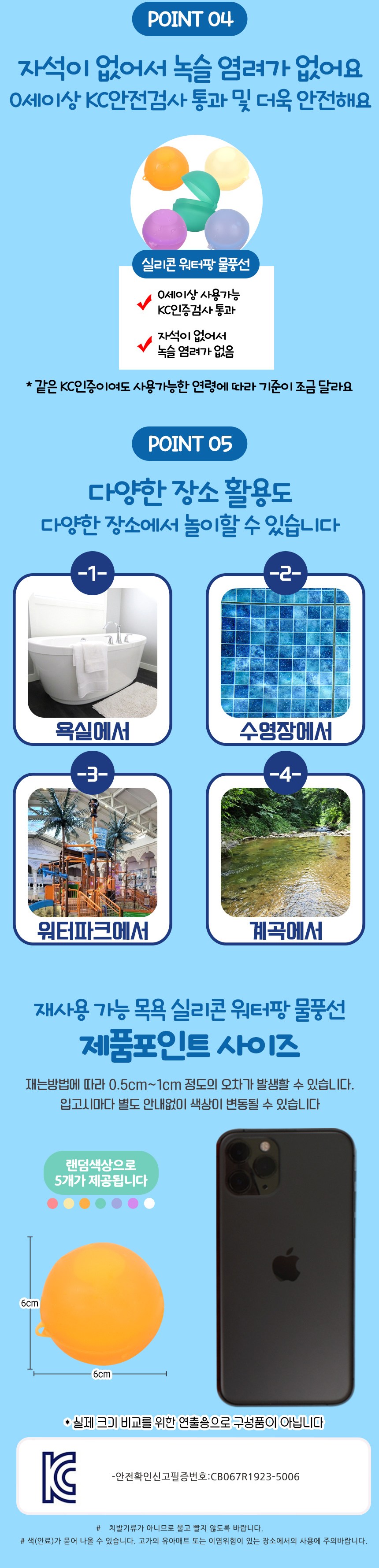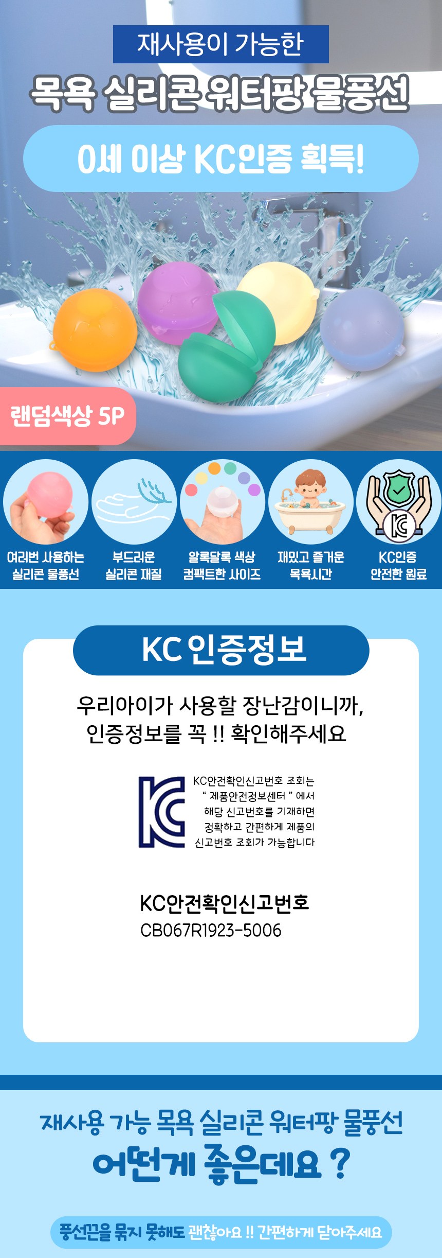 | 품명 및 모델명 | 목욕 실리콘 워터팡 물풍선 5개 세트 | KC 인증정보 | CB067R1923-5006 |