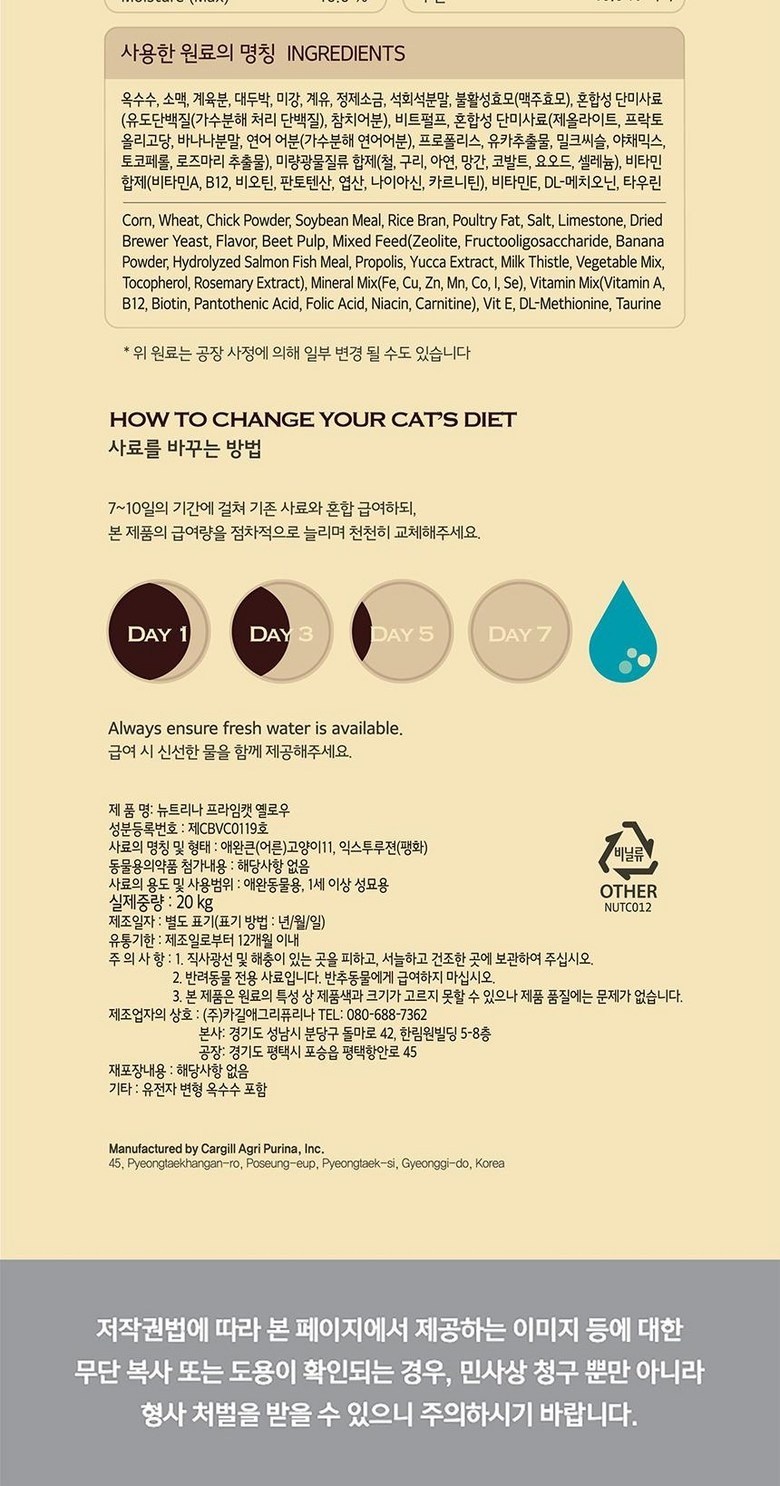 | 제조국(원산지) | 국내산 | 제조자(수입자) | (주)카길애그리퓨리나 |