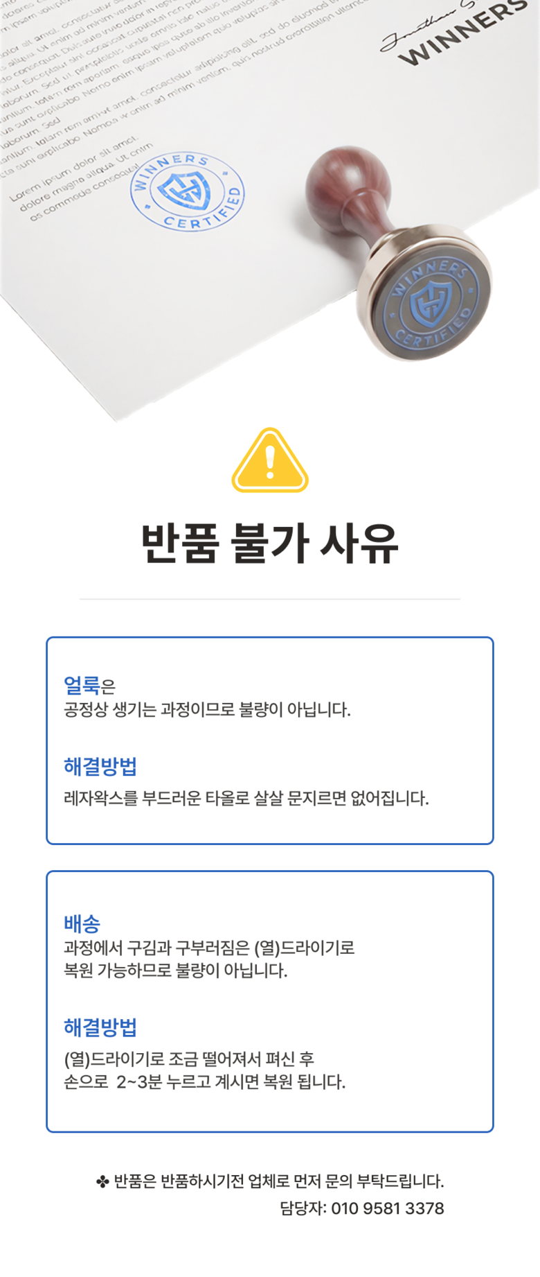 - ㆍ모니터 해상도의 차이로 인해 색상이나 이미지가 실제와 달라, 고객이 단순 변심으로 교환/반품을 무료로 요청하는 경우
