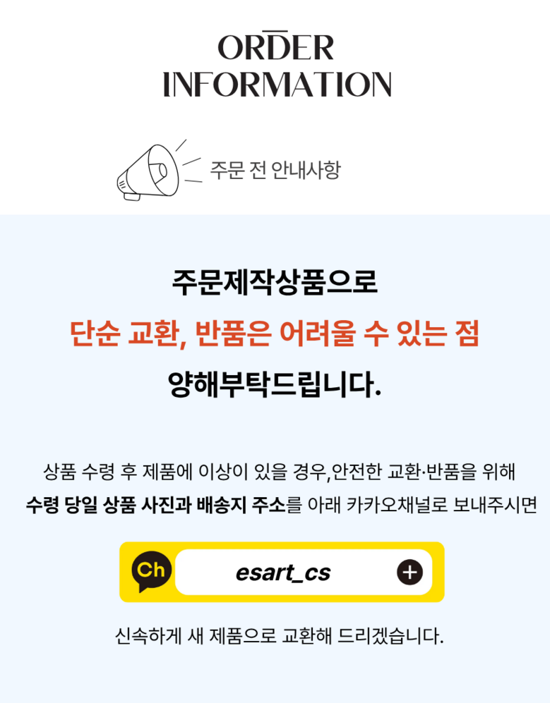 - ㆍ모니터 해상도의 차이로 인해 색상이나 이미지가 실제와 달라, 고객이 단순 변심으로 교환/반품을 무료로 요청하는 경우