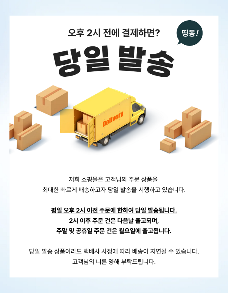 | 배송기간 | ㆍ도서산간 지역 등은 배송에 3-5일이 더 소요될 수 있습니다. - 천재지변, 물량 수급 변동 등 예외적인 사유 발생 시, 다소 지연될 수 있는 점 양해 부탁드립니다. | ||