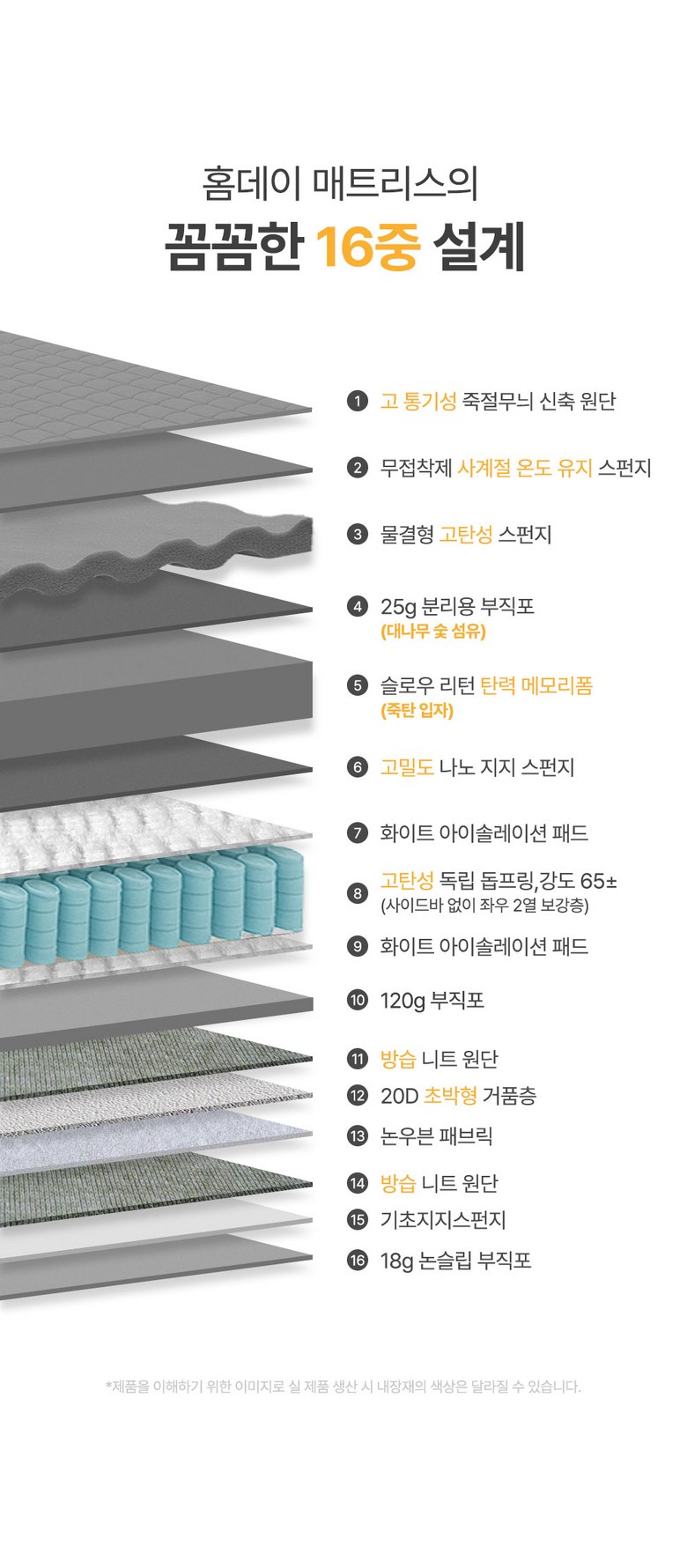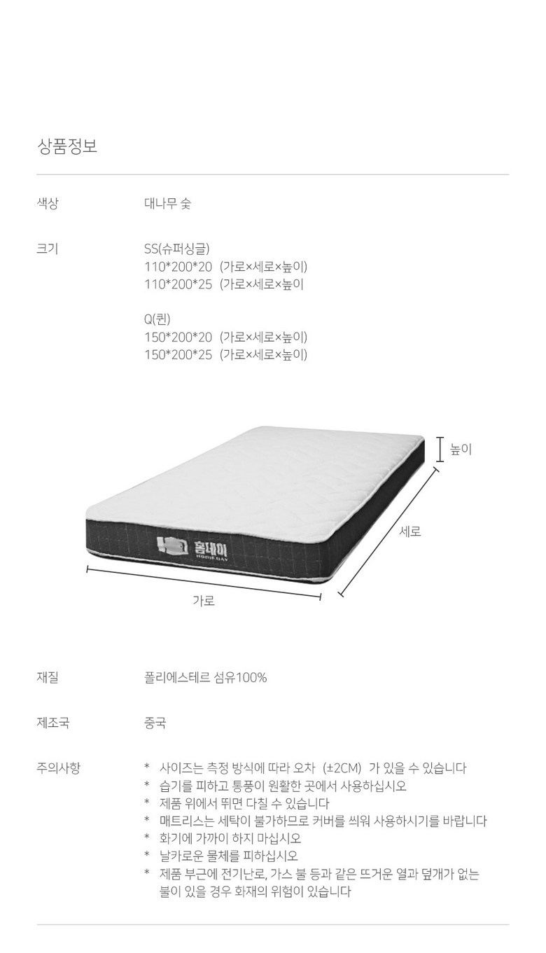 | 품명 및 모델명 | 홈데이 침대 매트리스 | 인증/허가 사항 | 상품 상세페이지 참조 |