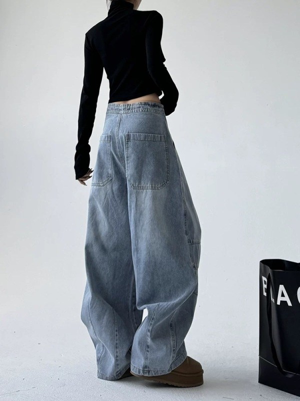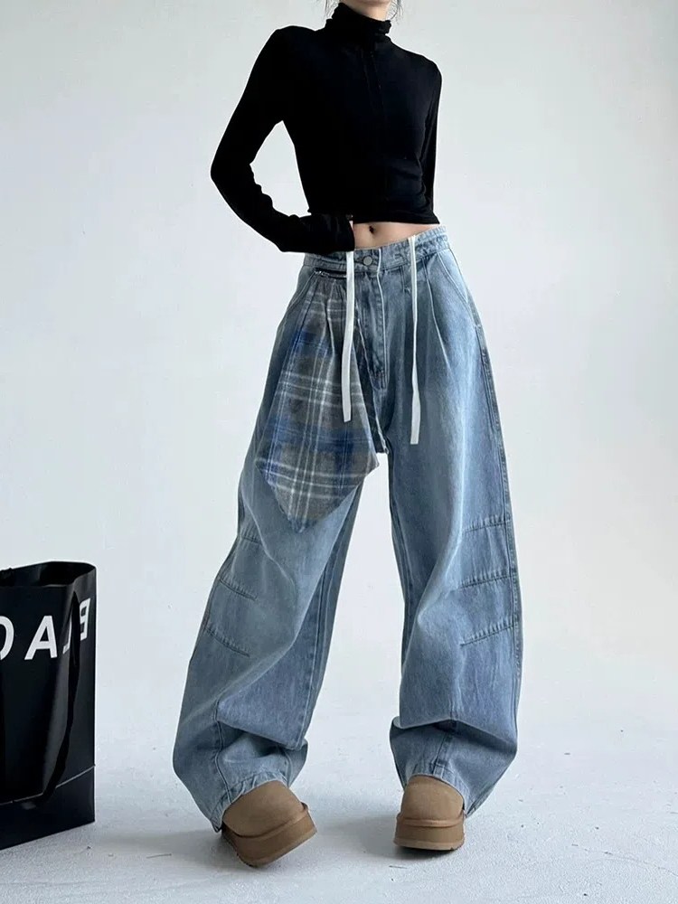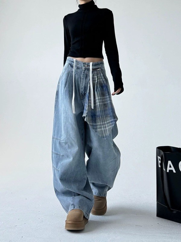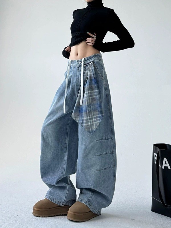 투니스 여성 체크 스카프 와이드 데님 긴바지