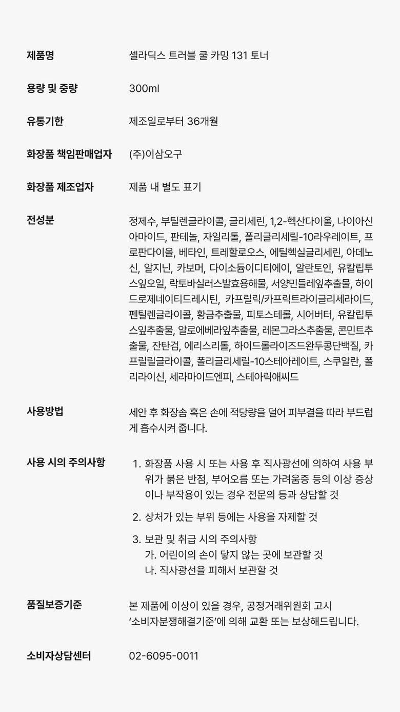| 화장품제조업자, 화장품책임판매업자 및 맞춤형화장품판매업자 | 상품 상세페이지 참조 | 제조국 | 상품 상세페이지 참조 |