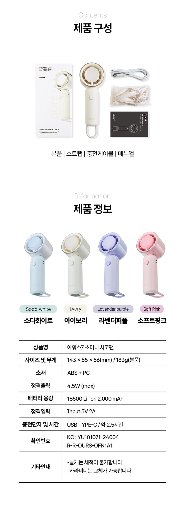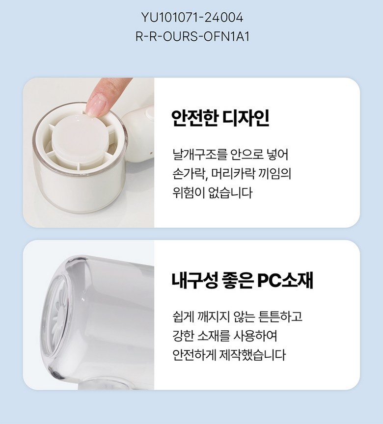 | 품명 및 모델명 | 고속 치코팬 핸디 선풍기 / OFN1A1LP | KC 인증정보 | 본품 : R-R-OURS-OFN1A1 / 전지 : YU101071-24004 |