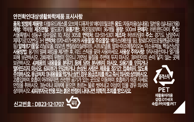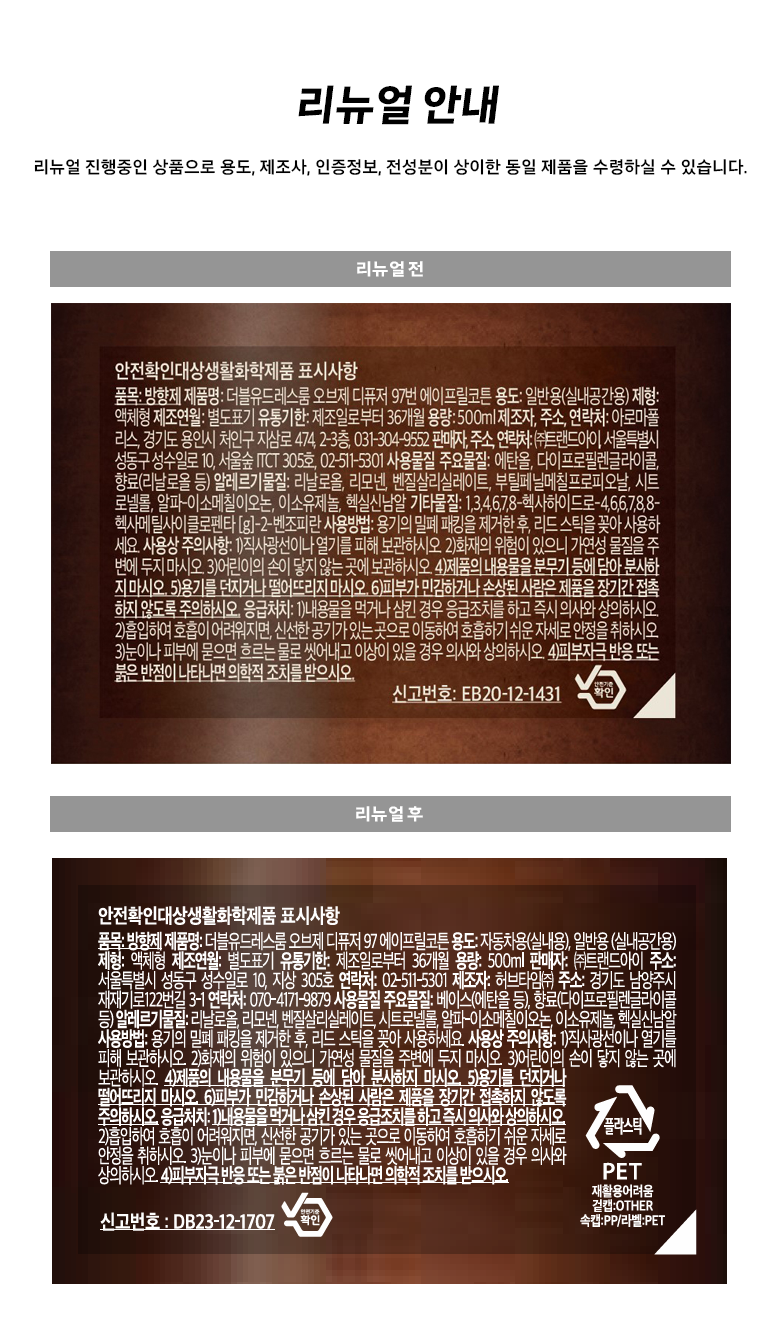 | 품목 및 제품명 | 방향제 / 더블유드레스룸 오브제 디퓨저 97 에이프릴코튼 | 용도(표백제의 경우 계열을 함께표시) 및 제형 | 리뉴얼 전 : 일반용(실내공간용) | 리뉴얼 후 : 자동차용(실내용), 일반용(실내공간용) / 액체형 |