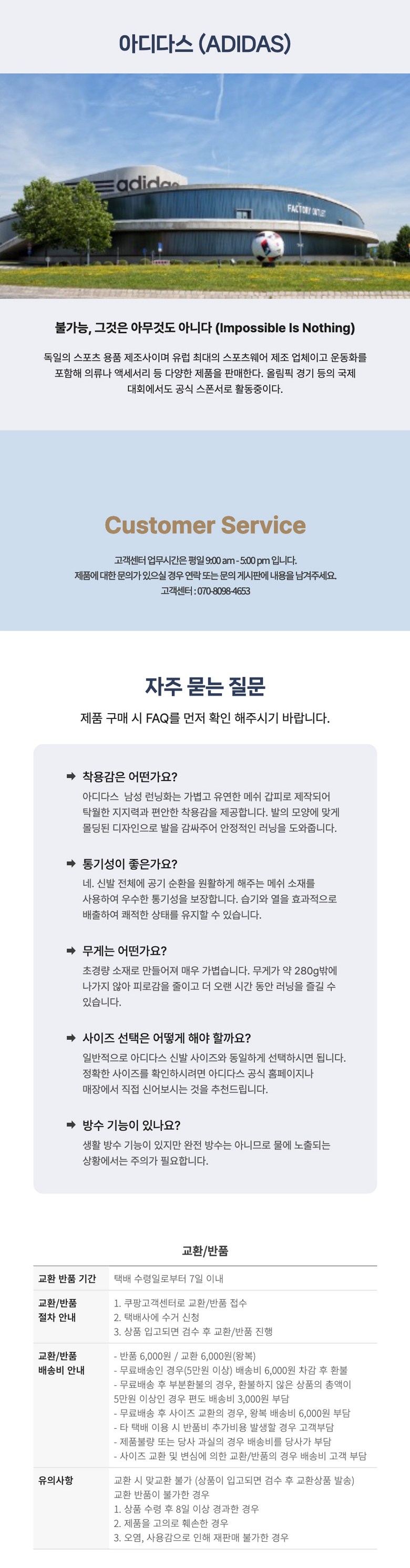 | 소비자상담 및 교환반품 문의 | 쿠팡고객센터 1577-7011 배송 및 환불/교환에 대한 문의는 마이쿠팡-고객센터 내 상담하기를 이용해주세요. | ||