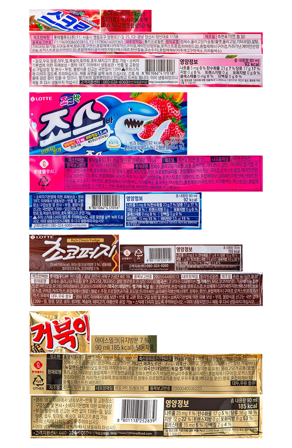 | 제품명 | 딸기 스크류바, 죠스바 오렌지&딸기, 초코퍼지, 거북이 | 식품의 유형 | 딸기 스크류바, 죠스바 오렌지&딸기 : 빙과 / 초코퍼지, 거북이: 아이스밀크 |
