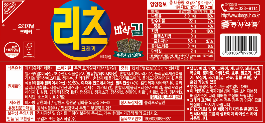 | 제품명 | 리츠 크래커 바삭 김 | 식품의 유형 | 컨텐츠 참조 |