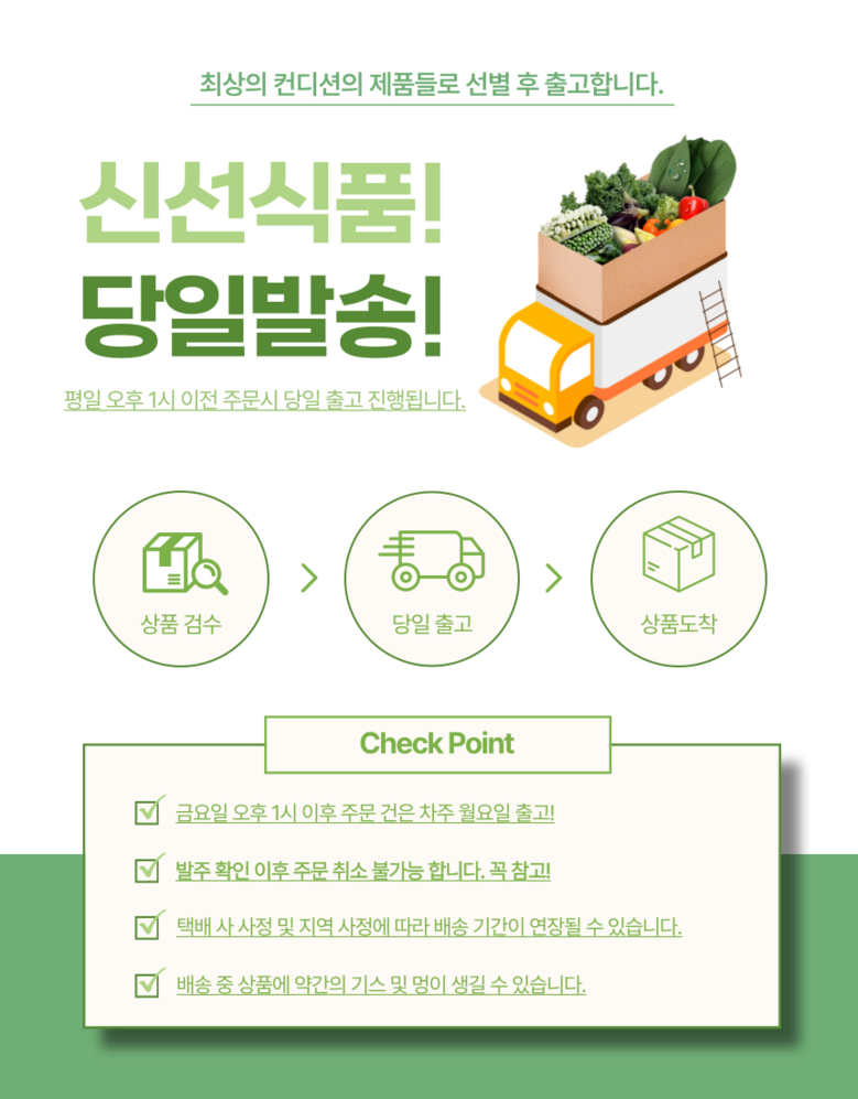 | 배송방법 | 신선/냉장/냉동 | 배송비 | 무료배송 - 도서산간 지역 배송불가 |