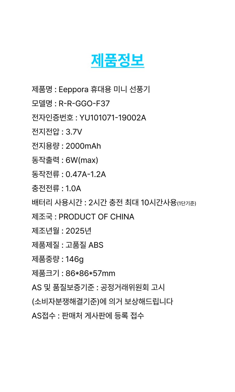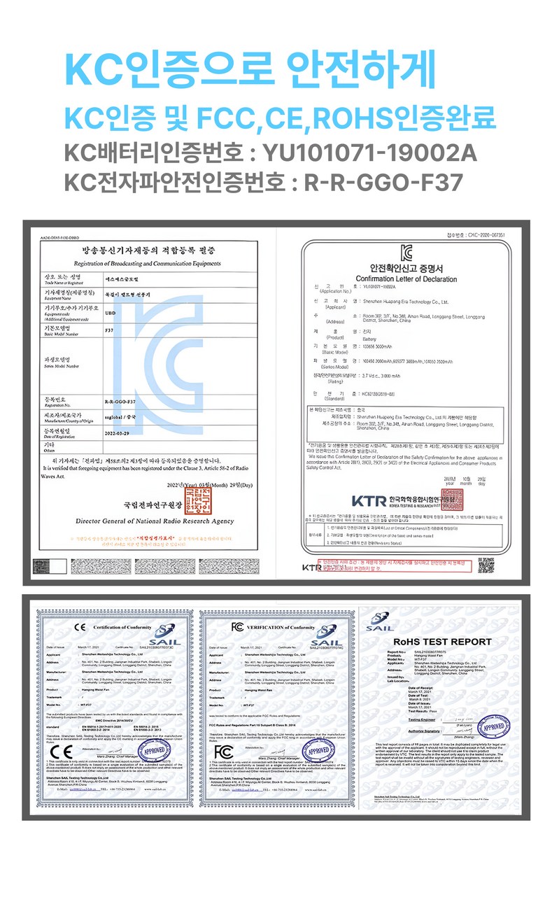| 품명 및 모델명 | Eeppora F37 | KC 인증정보 | KC배터리안전인증 : YU101071-19002A, KC전자파안전인증 : R-R-GGO-F37 |