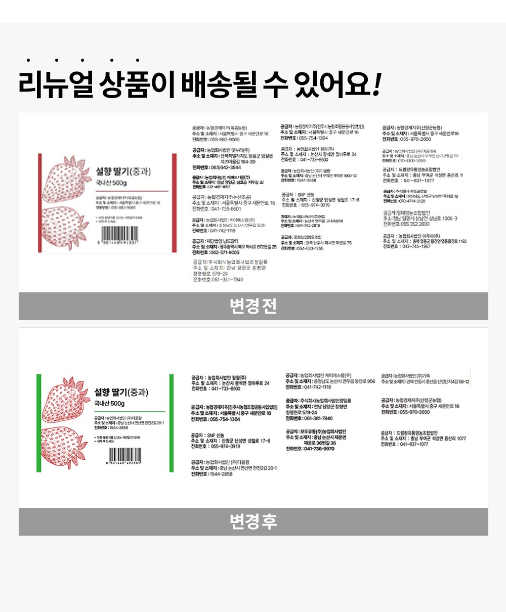 | 제조연월일, 소비기한 또는 품질유지기한 | 제조년월일 : 2026년 01월 23일 이후인 제조상품 | 세부 품목군별 표시사항 | 농수산물 : 유전자변형(해당 없음) / 지리적 표시사항(해당 없음) |