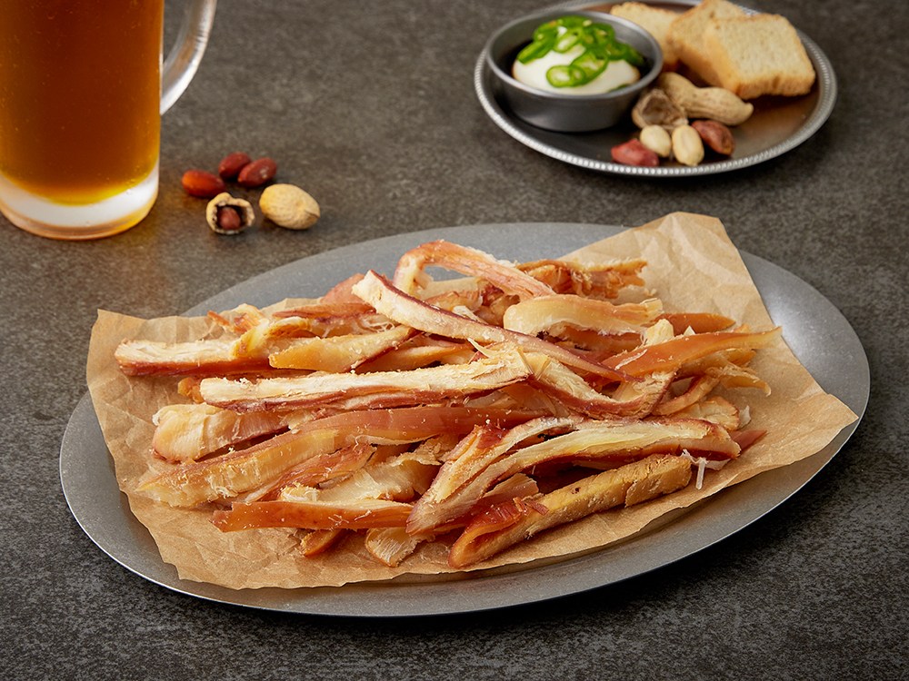 달짝지근하고 짭조름하게 조미한 바베큐 오징어예요. 길쭉하게 손질되어 그대로 쏙쏙 집어먹기 좋죠. 알맞게 말려 식감이 부드러우면서도 쫄깃하답니다. 청양 마요 소스를 곁들여 맥주 안주로 즐겨보세요. 여행이나 캠핑에 챙겨 간식으로 드셔도 좋아요.