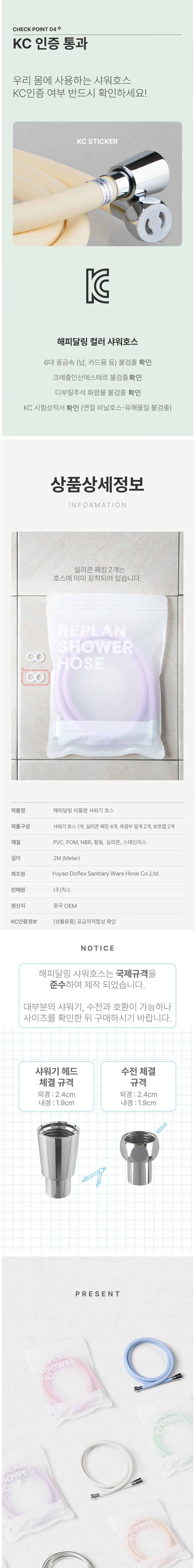 | 품명 및 모델명 | 해피달링 리플랜 샤워 호스 | 인증/허가 사항 | 유/KC마크 |