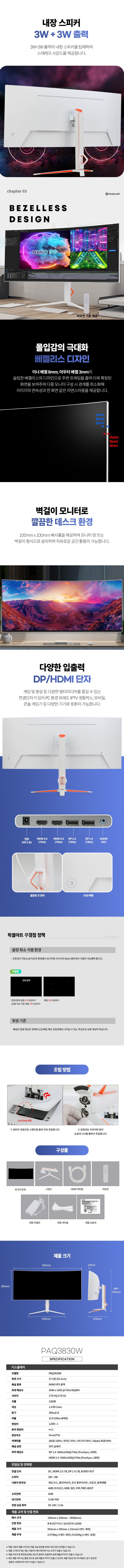 | 품명 및 모델명 | 모니터 / PAQ3830W | KC 인증정보 | 본품: 유/kc마크, R-R-D2T-F13 / 어댑터: SU10578-21006 |