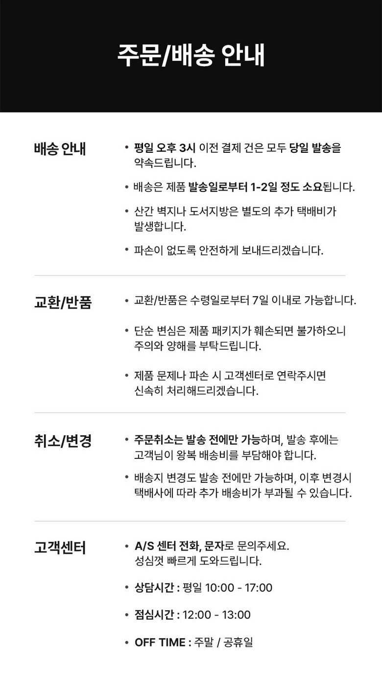 - ㆍ모니터 해상도의 차이로 인해 색상이나 이미지가 실제와 달라, 고객이 단순 변심으로 교환/반품을 무료로 요청하는 경우