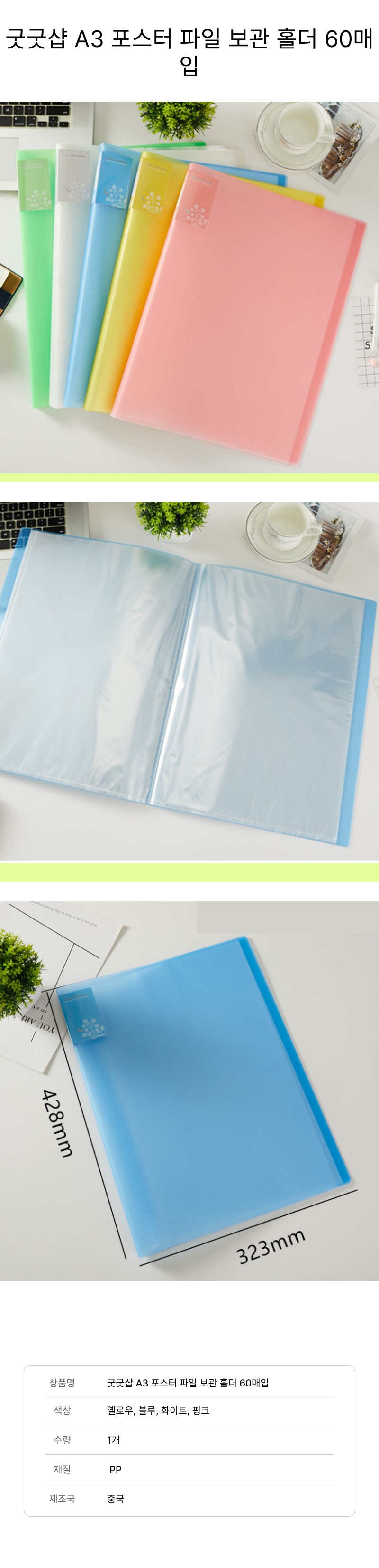 | 품명 및 모델명 | 굿굿샵 A3 포스터 파일 보관 홀더 60매입 | 인증/허가 사항 | 해당없음 |