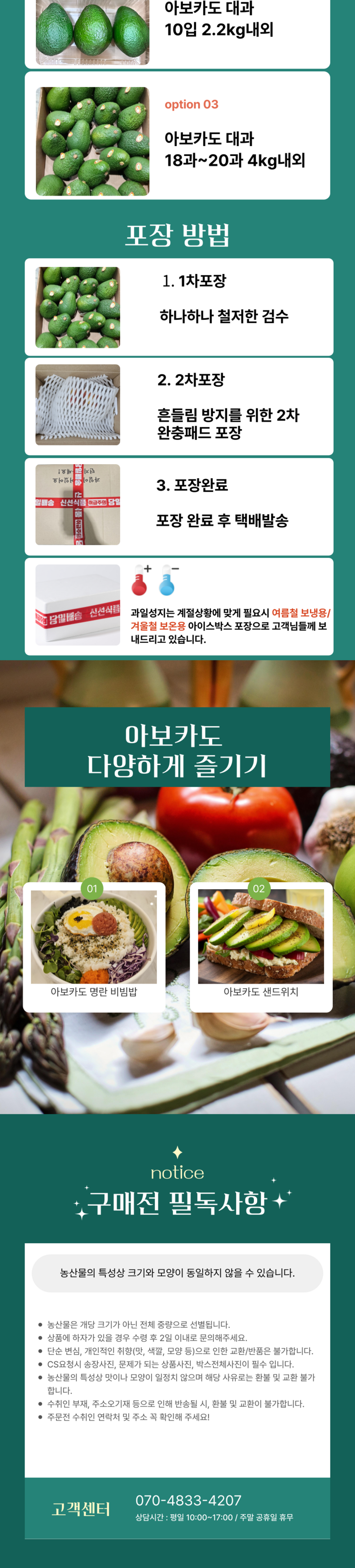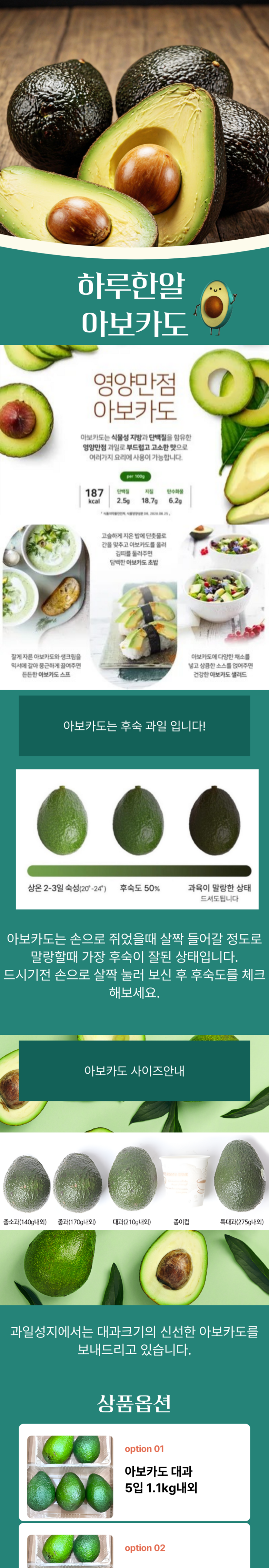 | 품목 또는 명칭 | 아보카도 대과 | 포장단위별 내용물의 용량(중량),수량,크기 | 아보카도 5과 1.1kg(개당 220g내외),아보카도 10과 2.2kg(개당 220g내외),아보카도 20과 4.4kg(개당 220g내외) |
