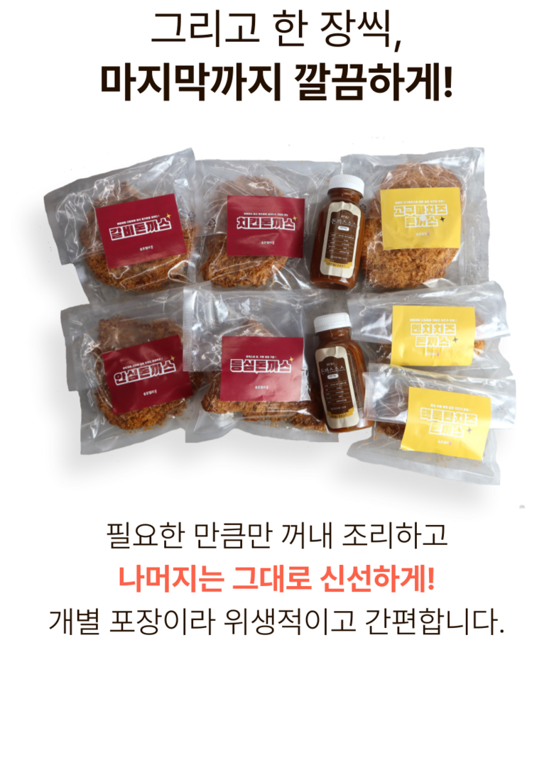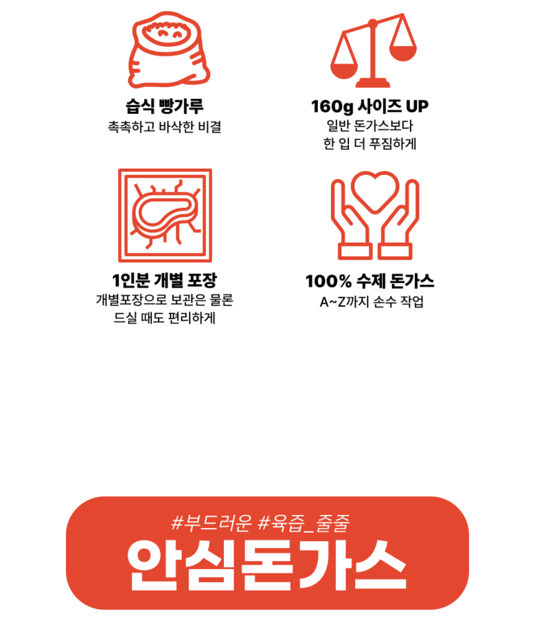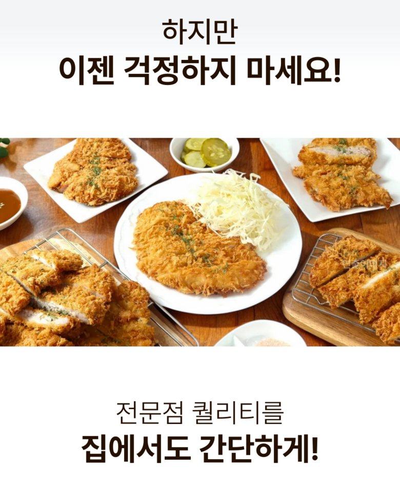 | 포장단위별 내용물의 용량(중량), 수량 | 1ea*160g, 4장(4팩) | 원재료명 및 함량 | 안심돈까스[돼지고기 안심(국내산)], 습식빵가루, 콩기름, 계란베타믹스 [대두, 밀. 돼지고기, 계란 함유] |