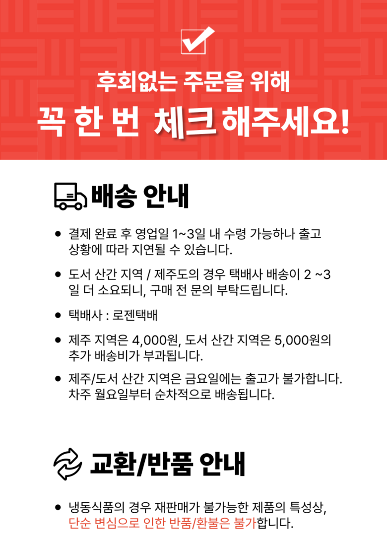 | 배송방법 | 신선/냉장/냉동 | 배송비 | 3,500원 - 30,000원 이상 구매 시 무료배송 · 도서산간 추가 배송비 - 제주 지역: 4,000원 - 도서산간 지역: 5,000원 |