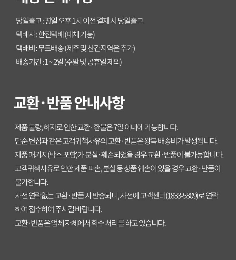 | 소비자상담 및 교환반품 문의 | 쿠팡고객센터 1577-7011 배송 및 환불/교환에 대한 문의는 마이쿠팡-고객센터 내 상담하기를 이용해주세요. | ||