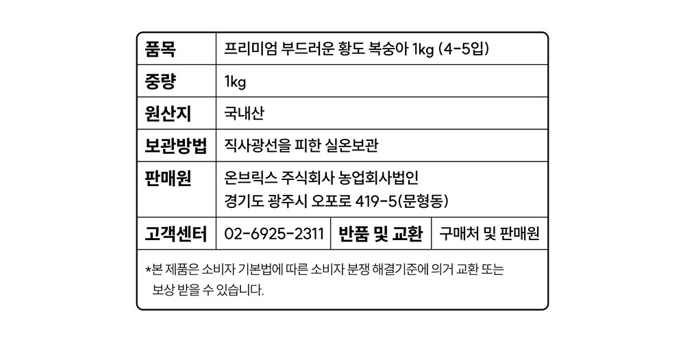 복숭아가 나오기 시작했다는 건, 그만큼 날이 더워졌다는 증표인데요. 선명한 주홍빛으로 물든 황도 복숭아는 보는 것만으로도 입에 침이 고이게 하는 과일이죠. 나뭇가지에서 80% 이상 익은 원물만 수확해 과육에 빈틈이 없고 부드러운 식감이 일품이에요. 반을 가르면 나오는 노란 과육을 한 입 베어 물면, 기분 좋은 새콤함과 함께 진한 달콤함을 느낄 수 있죠. 개당 200~250g 내외의 큼직한 원물로만 엄선했으니 마음 놓고 즐기세요.