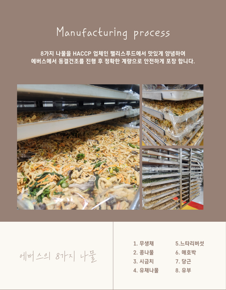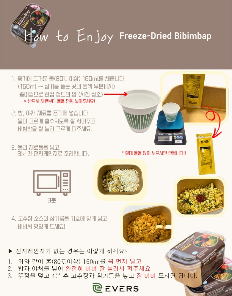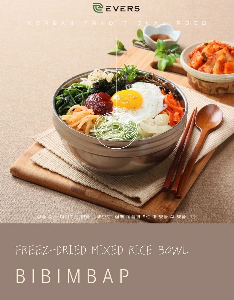| 포장단위별 내용물의 용량(중량), 수량 | 100g | 원재료명 및 함량 | 동결건조밥:쌀(국산),고추장비빔소스:고추장[{물엿,고추양념(중국산),현미(외국산),천일염,주정},설탕,정제수,산분해간장(탈지대두:외국산),물엿],동결건조야채(혼합야채):무생채[무(국산),분말양념{가공소금,마늘가루},고추가루],느타리버섯무침[느타리버섯(국산),분말양념{가공소금,마늘가루}],콩나물,유채,시금치,유부,당근,호박,참기름:참깨100% |